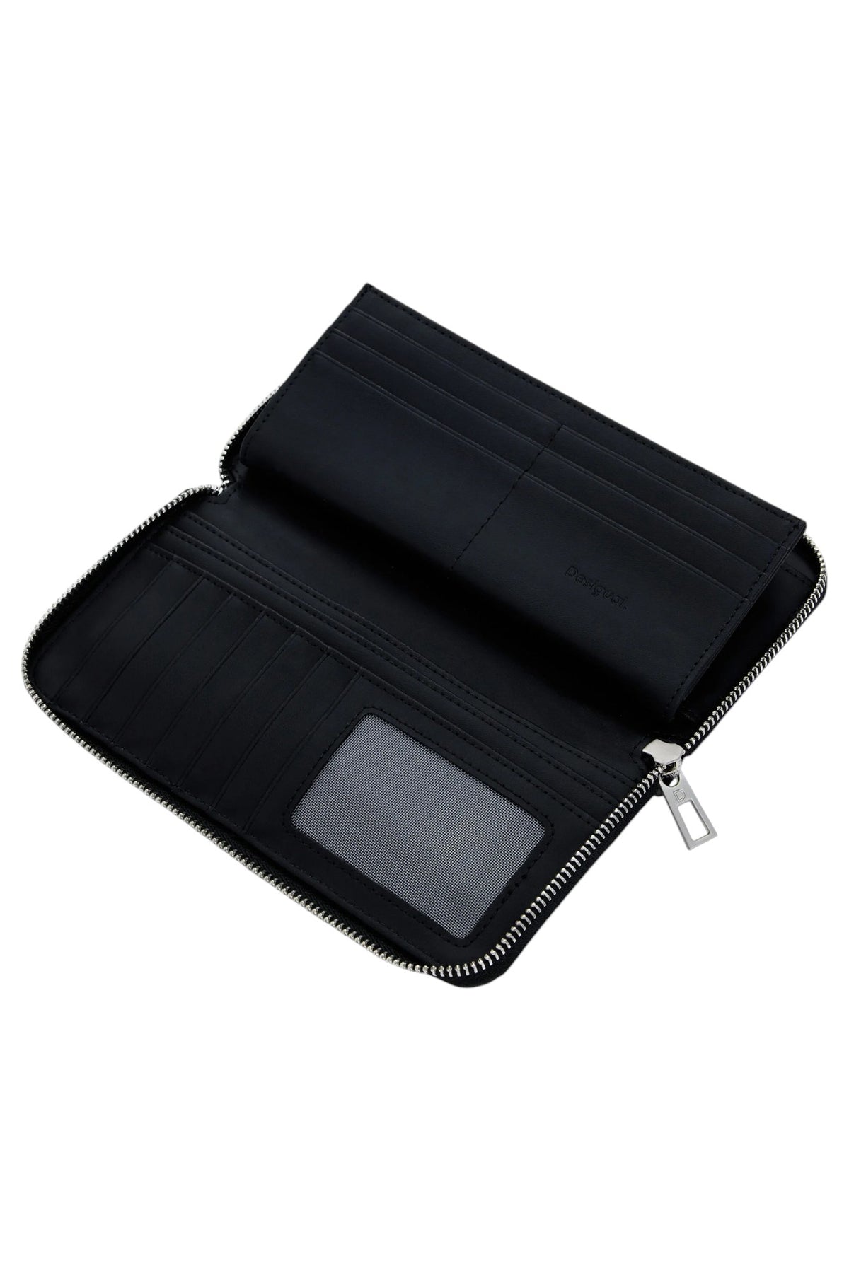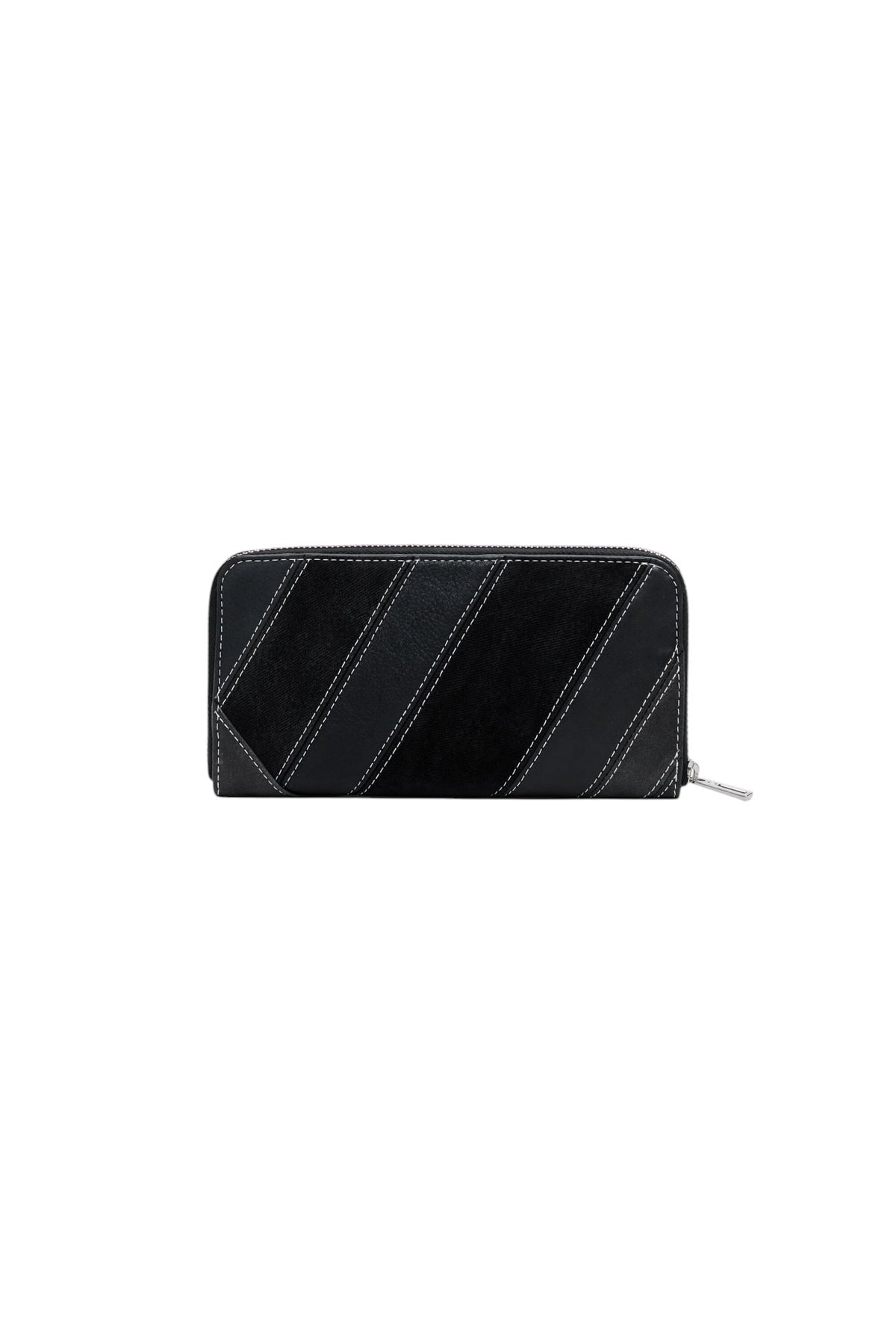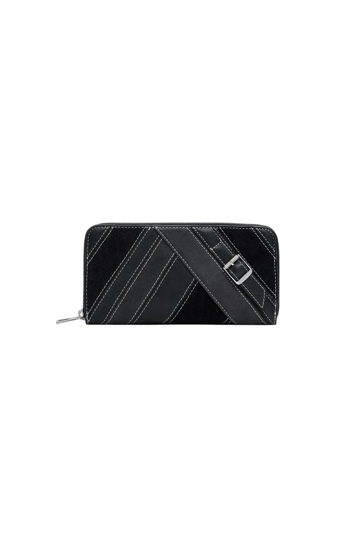 Portafoglio medio effetto pelle con cuciture decorative, cinturino con fibbia metallica, diversi scomparti e chiusura con cerniera.