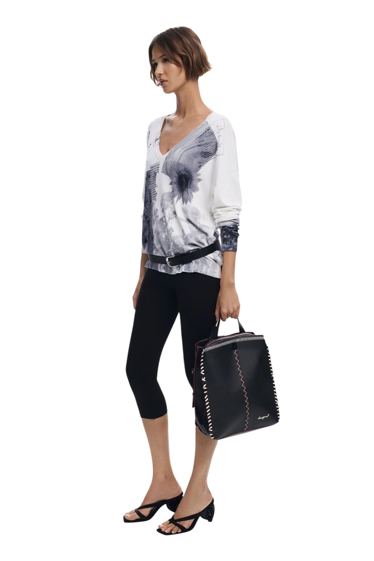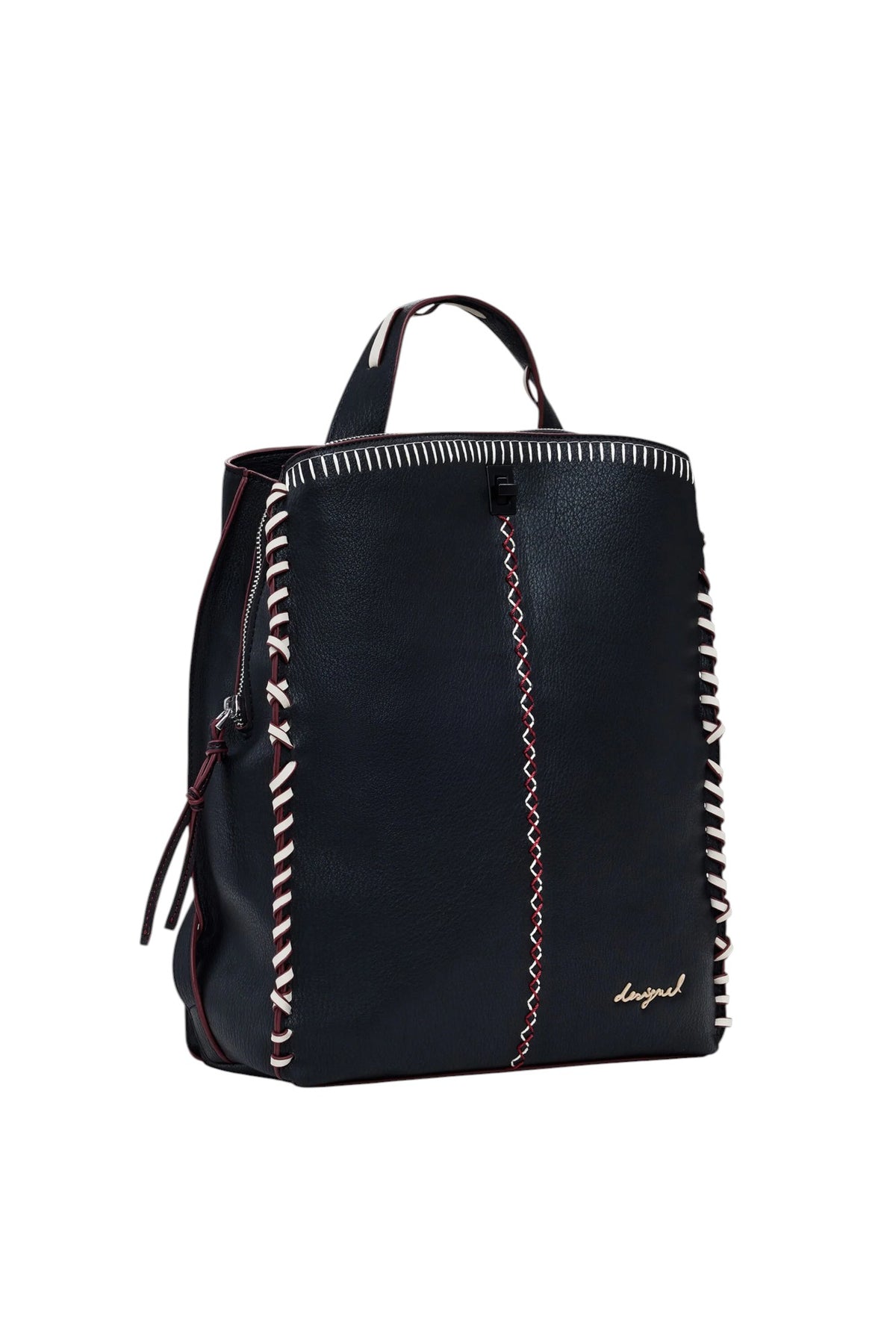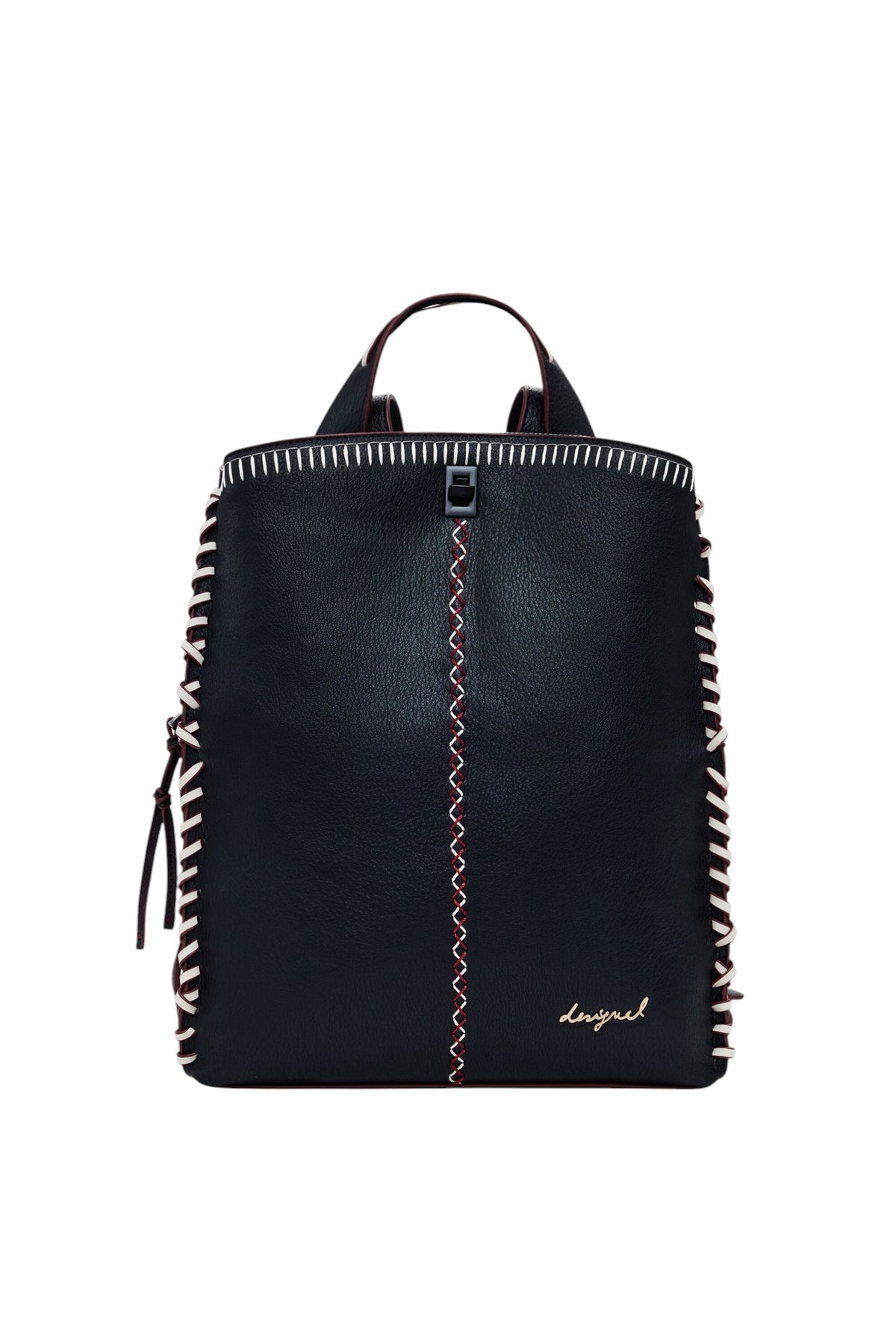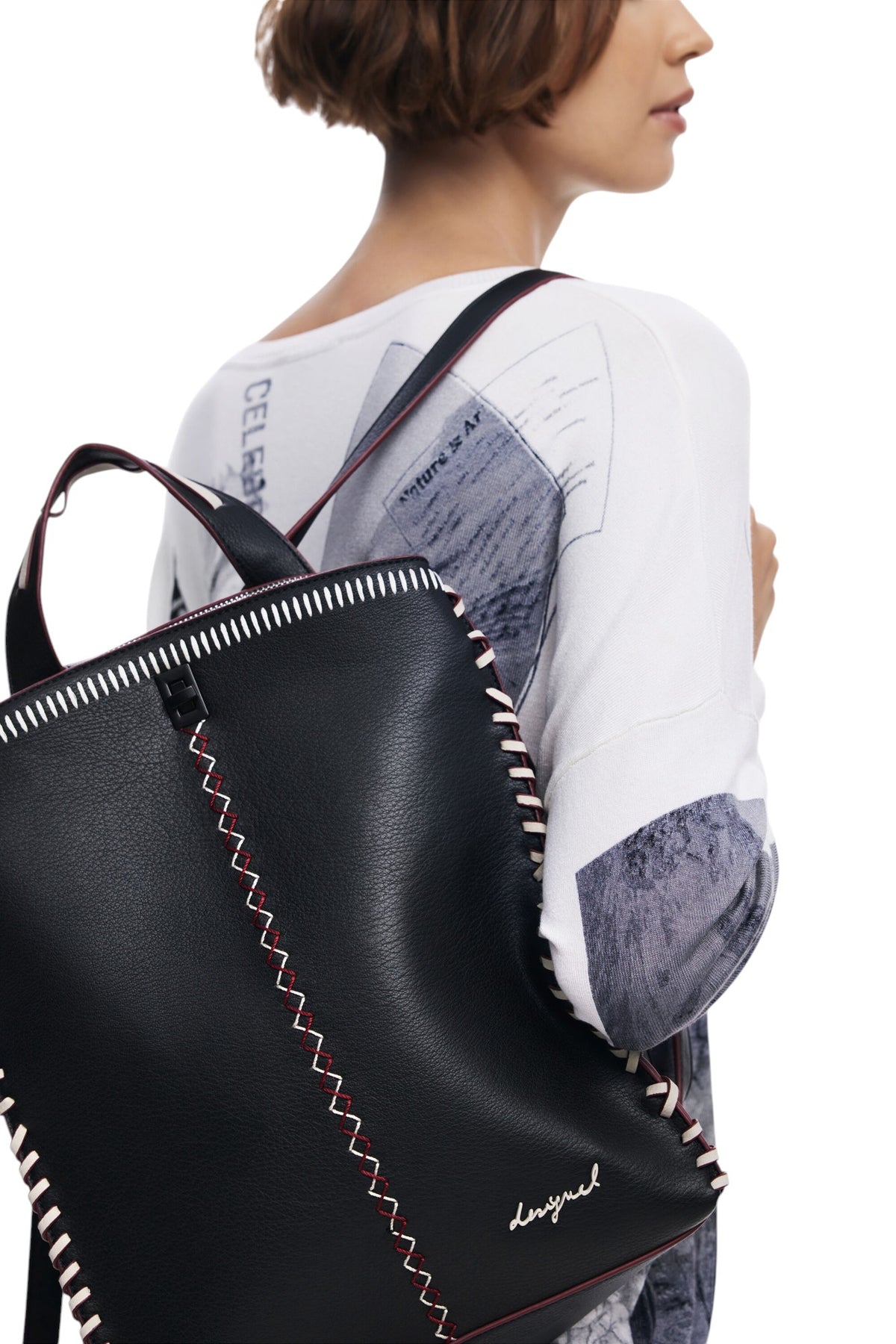 Zaino grande in effetto pelle con impunture a contrasto, vari scomparti e manico tipo borsa rimovibile.