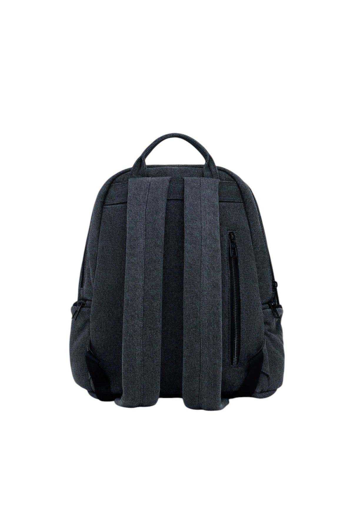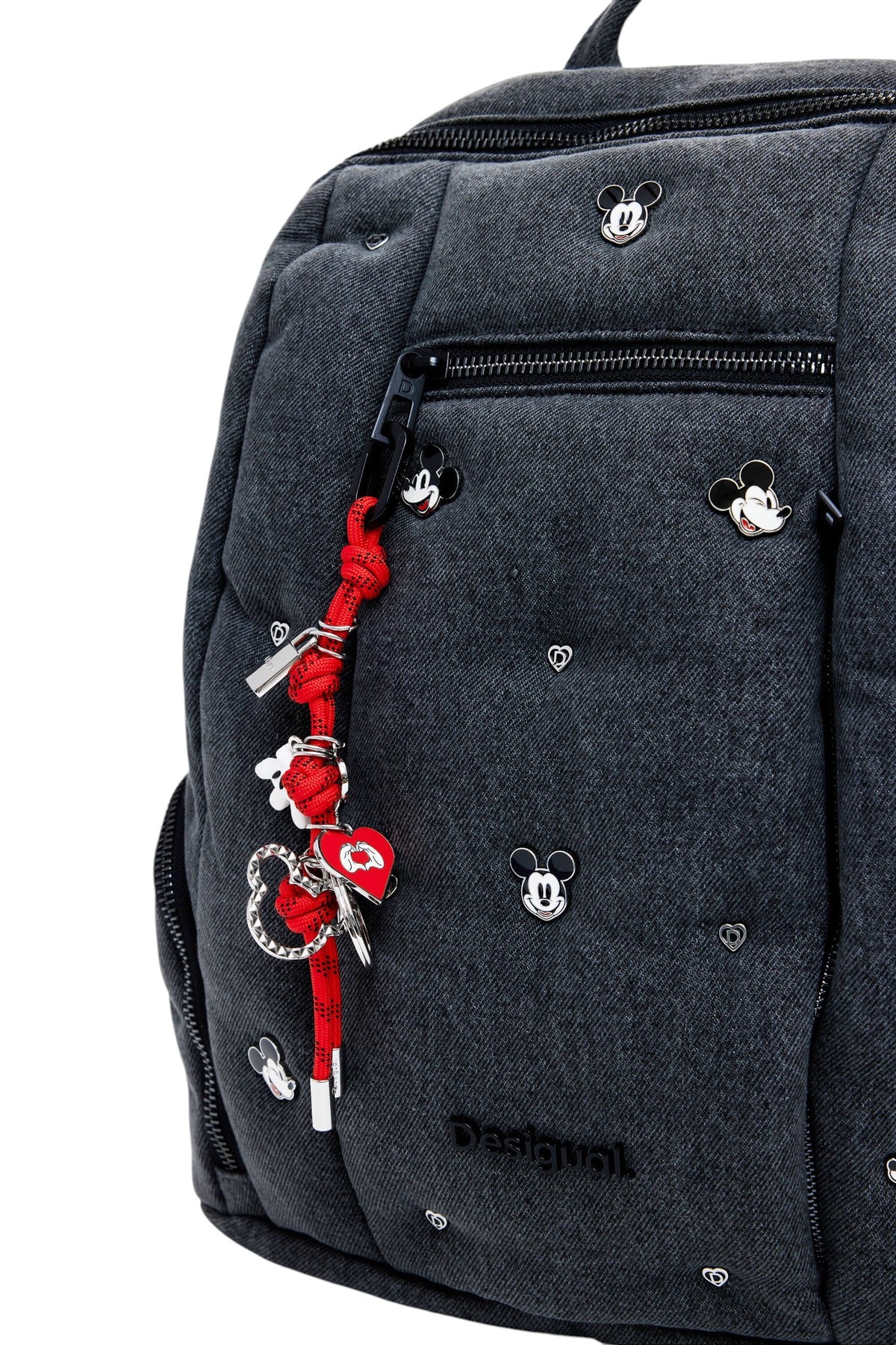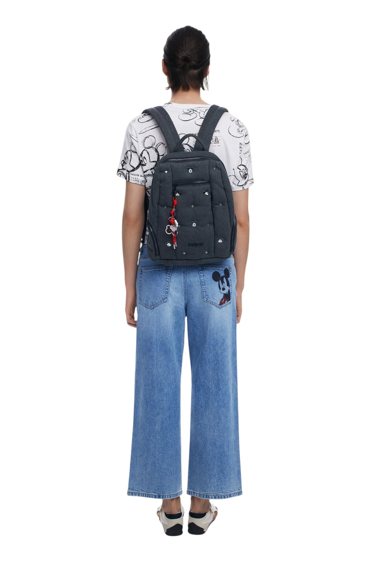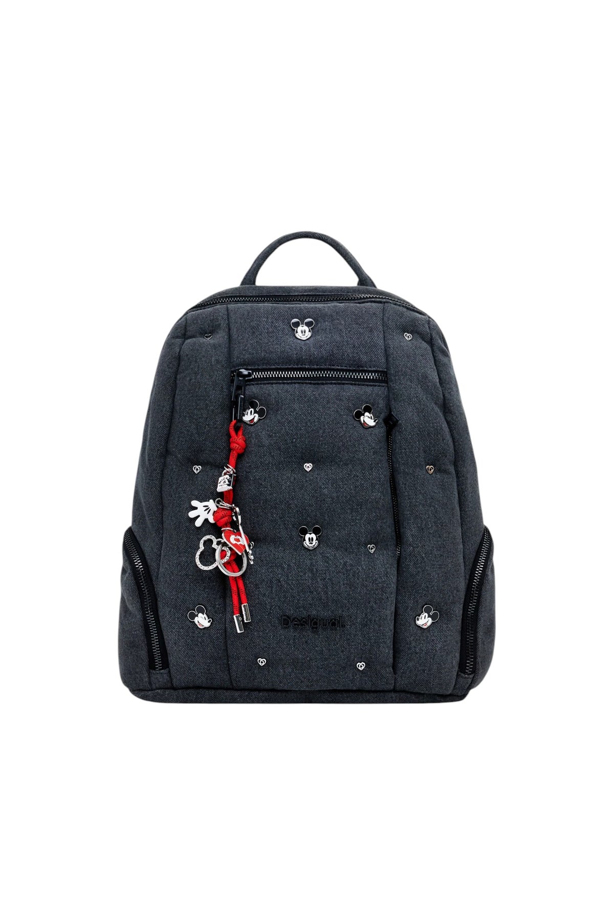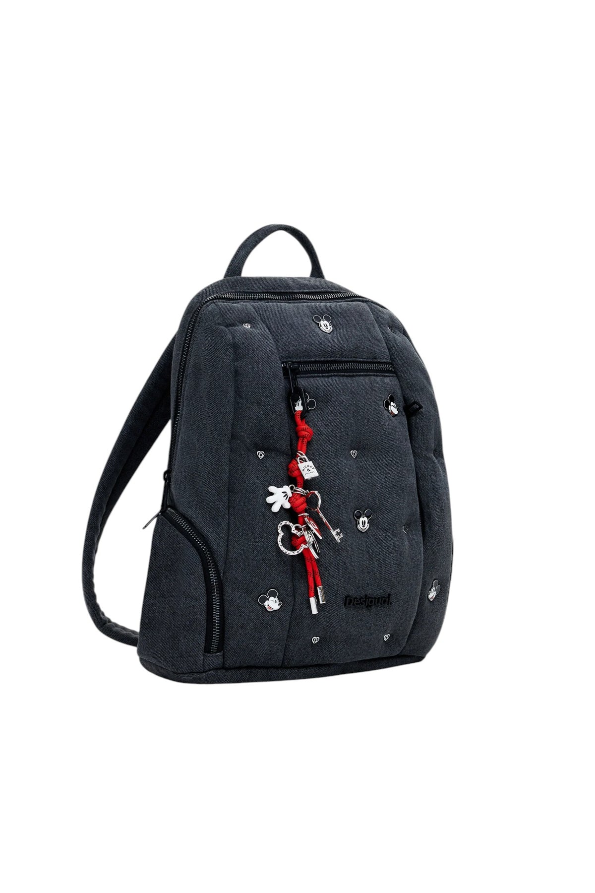 Zaino medio in denim con molteplici tasche esterne, placchette metalliche con logo e Mickey Mouse™, portachiavi rimovibile e tasca interna.