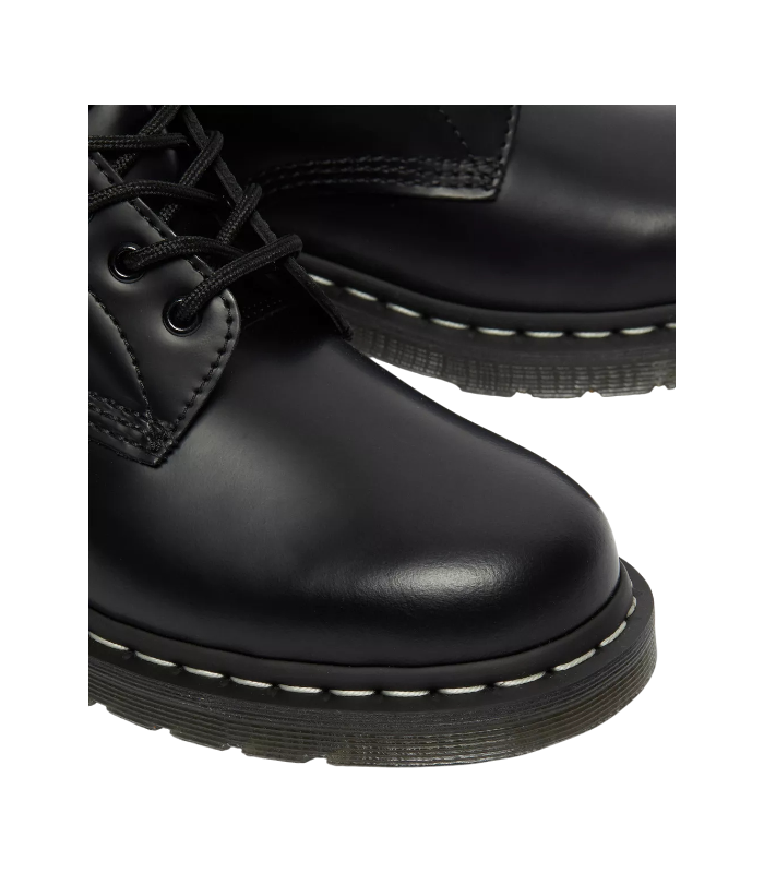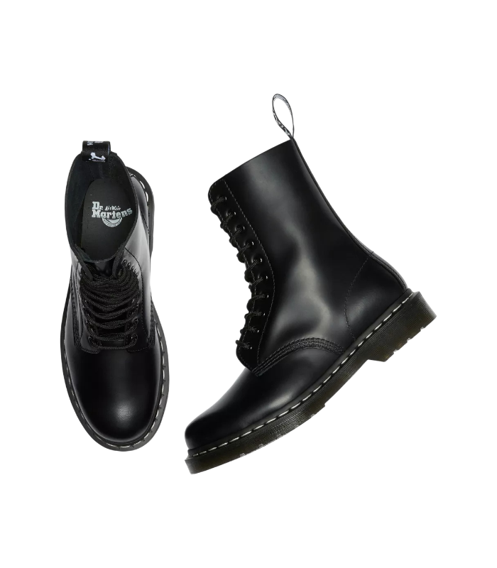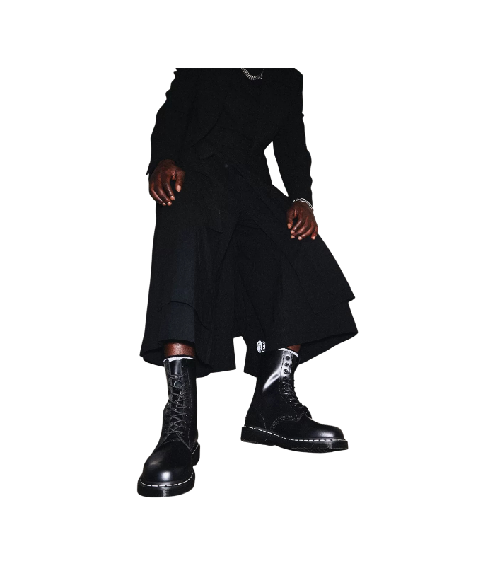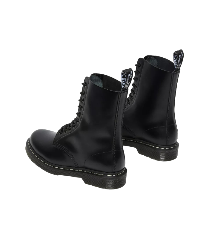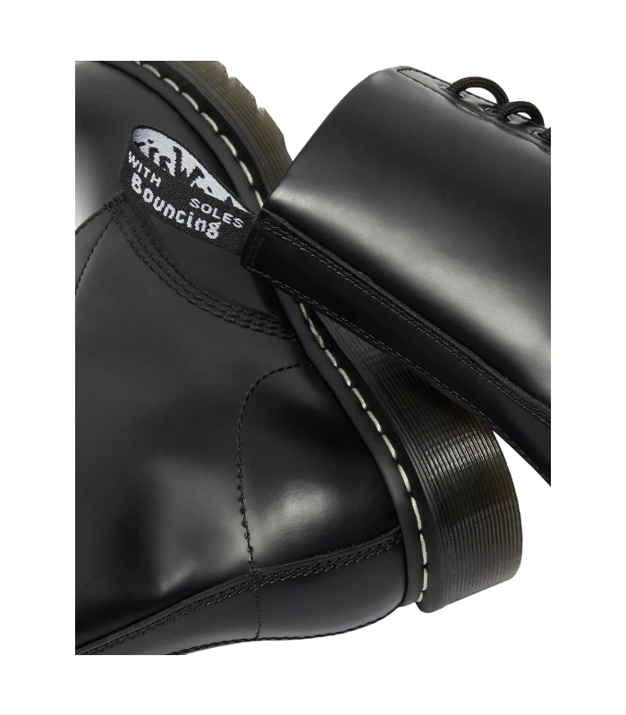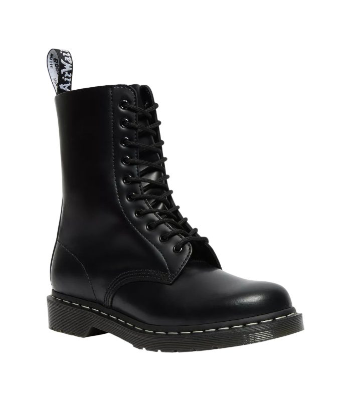 Una rivisitazione punk del classico 1490, con cuciture bianche a contrasto e fettuccia posteriore in bianco e nero. Realizzato in resistente pelle Smooth, è montato sulla classica suola Dr. Martens con cuscinetto d’aria, resistente a olio, grasso, abrasione e scivolamento.