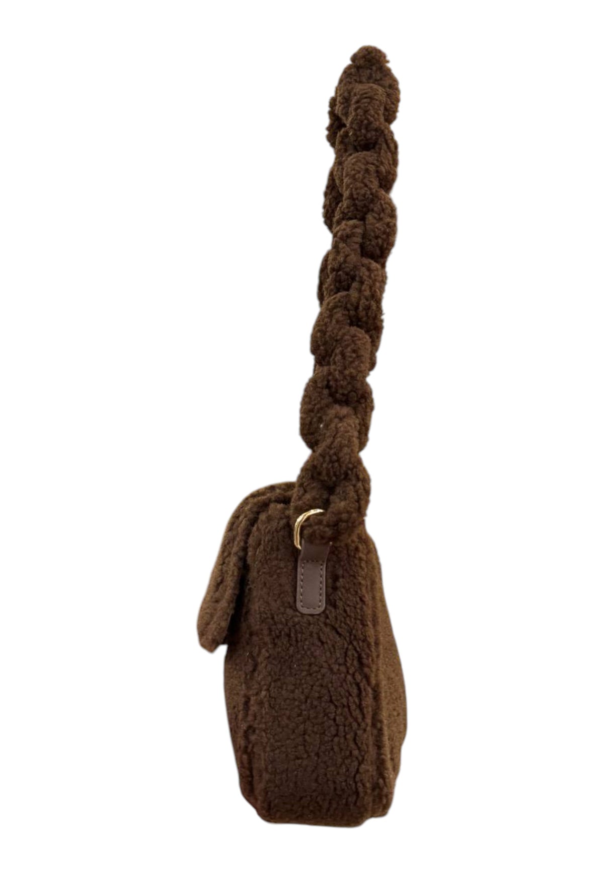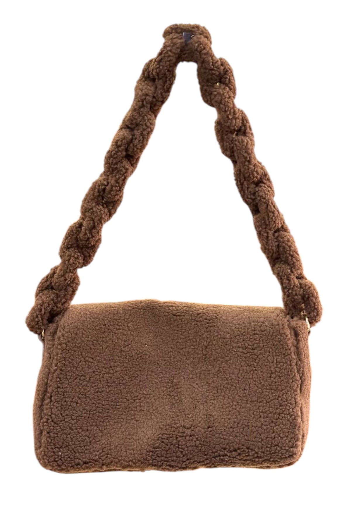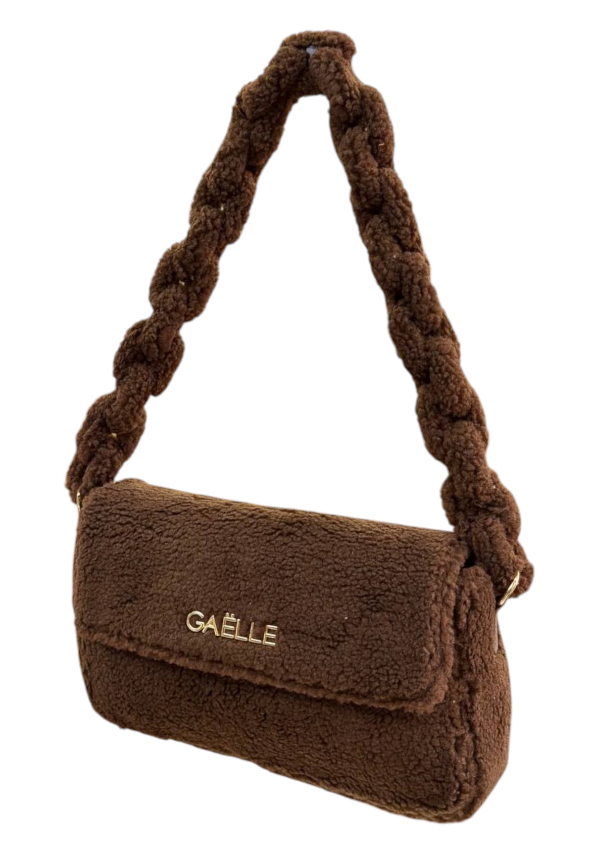 Borsa firmata Gaëlle Paris in ecofur con chiusura meccanica, scomparto interno, tre taschini di cui uno con chiusura a zip, manico in catena rivestito in ecofur, tracolla rimuovibile e logo metallico.