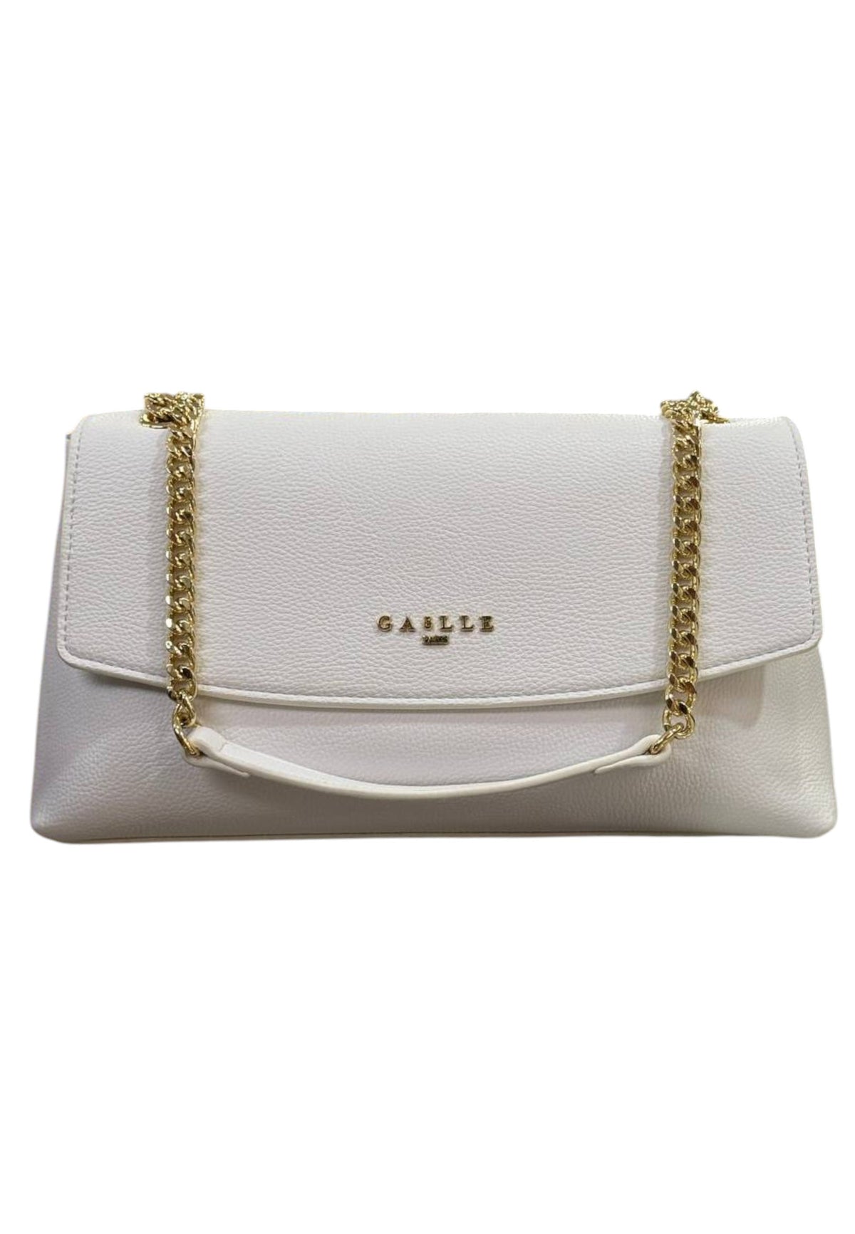Borsa firmata Gaëlle Paris in ecopelle con chiusura magnetica, tre scomparti interni, scomparto con zip, manico in catena convertibile in tracolla e logo metallico.