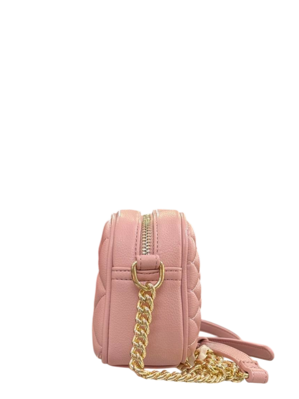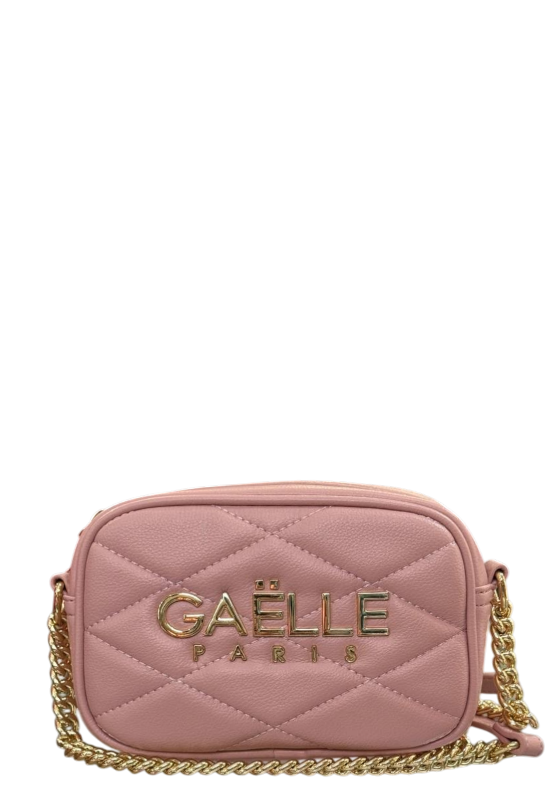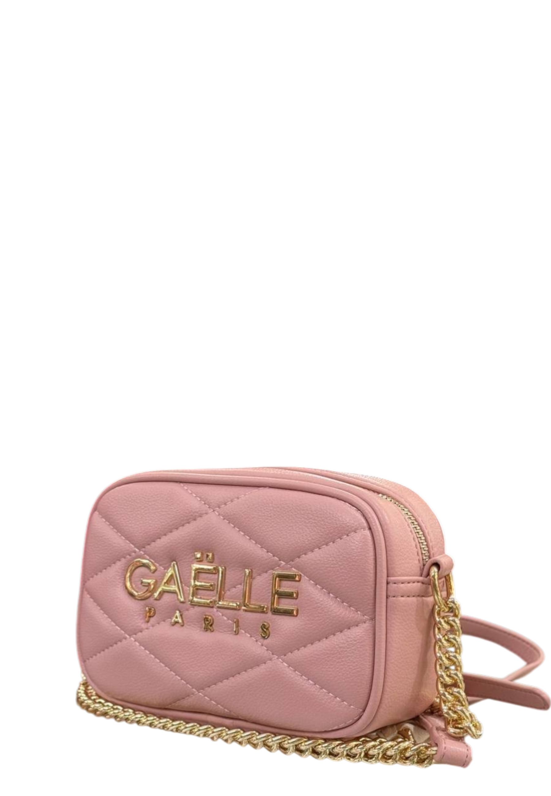 Pochette Gaëlle Paris in ecopelle con logo metallico dorato posizionato frontalmente, chiusura con zip, taschino interno chiudibile con zip e tracolla in catena ed ecopelle.