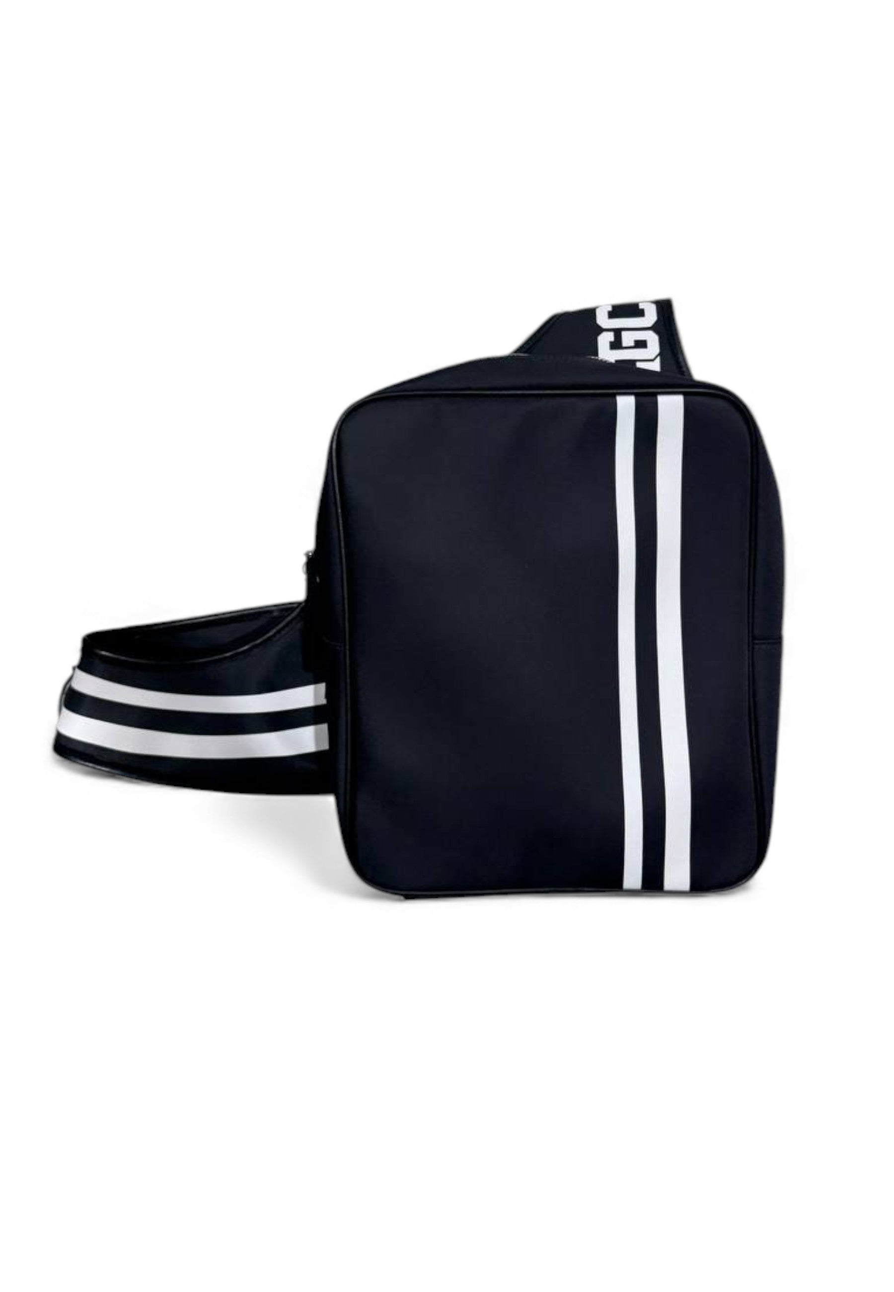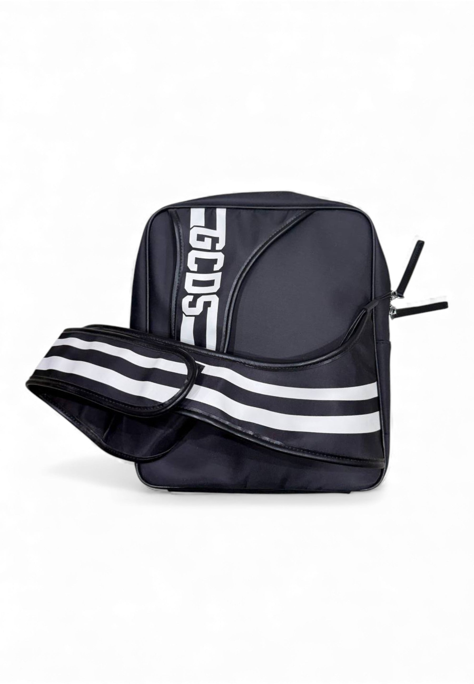 Borsa a tracolla GCDS. Nera con strisce bianche. Logo sul manico. Lunghezza regolabile tramite nastro a strappo. Chiusura a zip nella parte superiore.