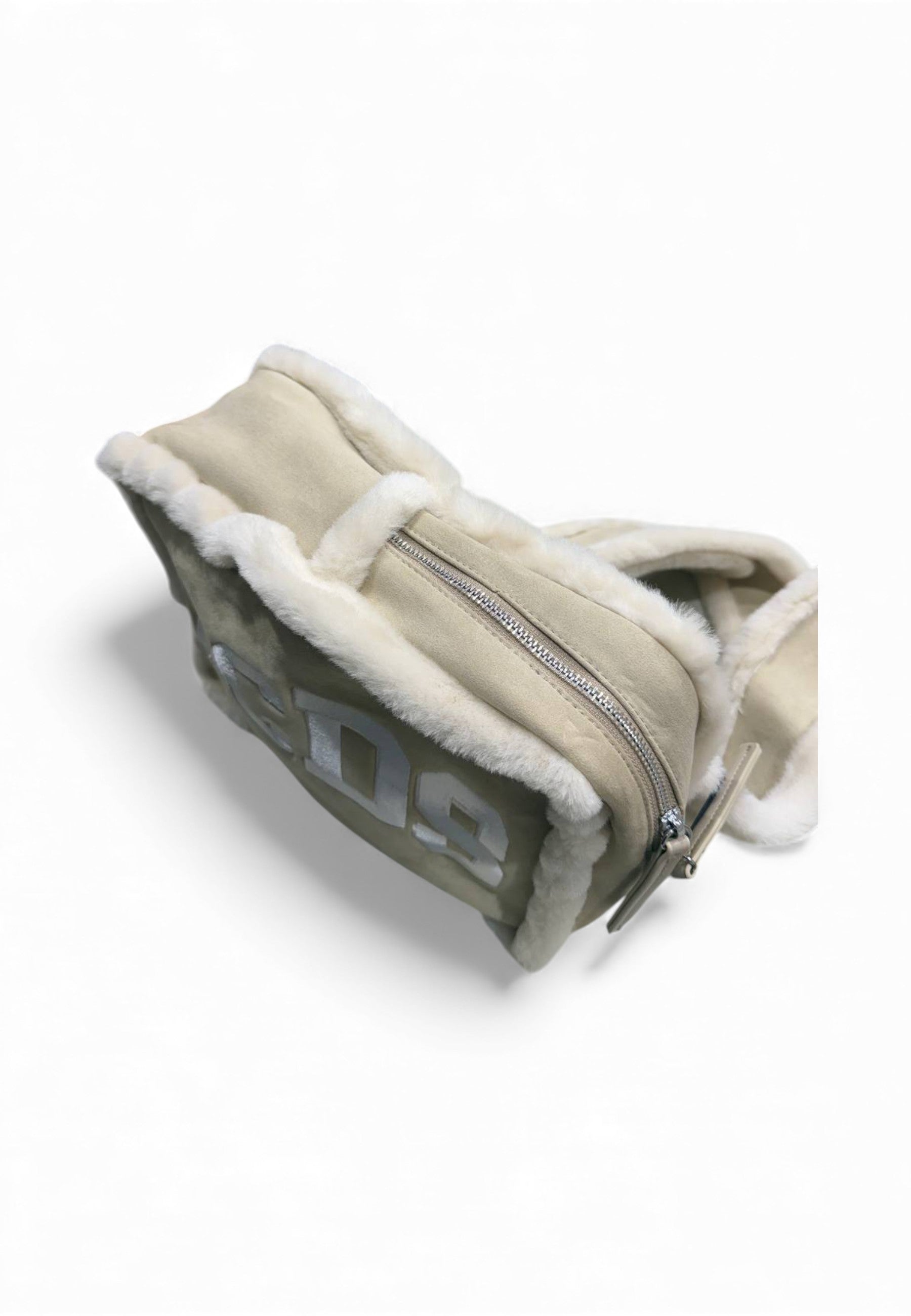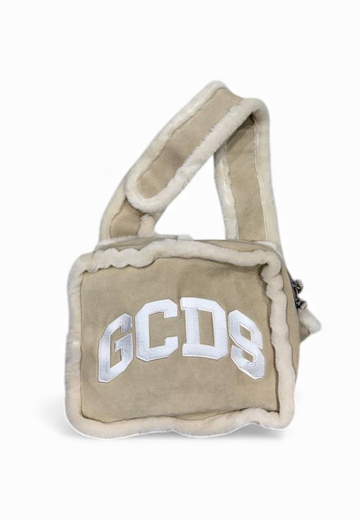 Borsa a tracolla GCDS in shearling sintetico beige. Lunghezza regolabile tramite nastro a strappo. Chiusura a zip nella parte superiore.