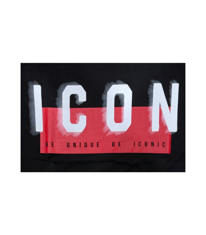 T-shirt Icon, con girocollo classico a maniche corte, ideale per un look casual. La maglietta è caratterizzata dalla scritta "icon" centrale con un effetto sfumato, a contrasto con un rettangolo rosso dove troviamo la scritta " be unique be iconic".