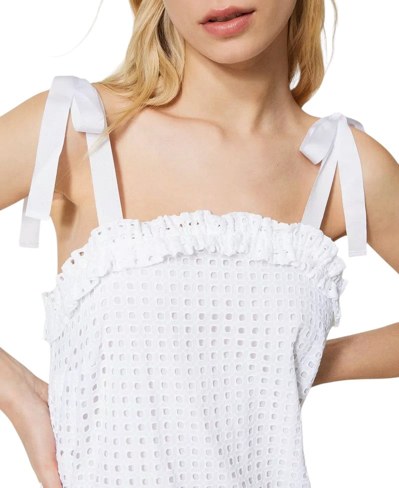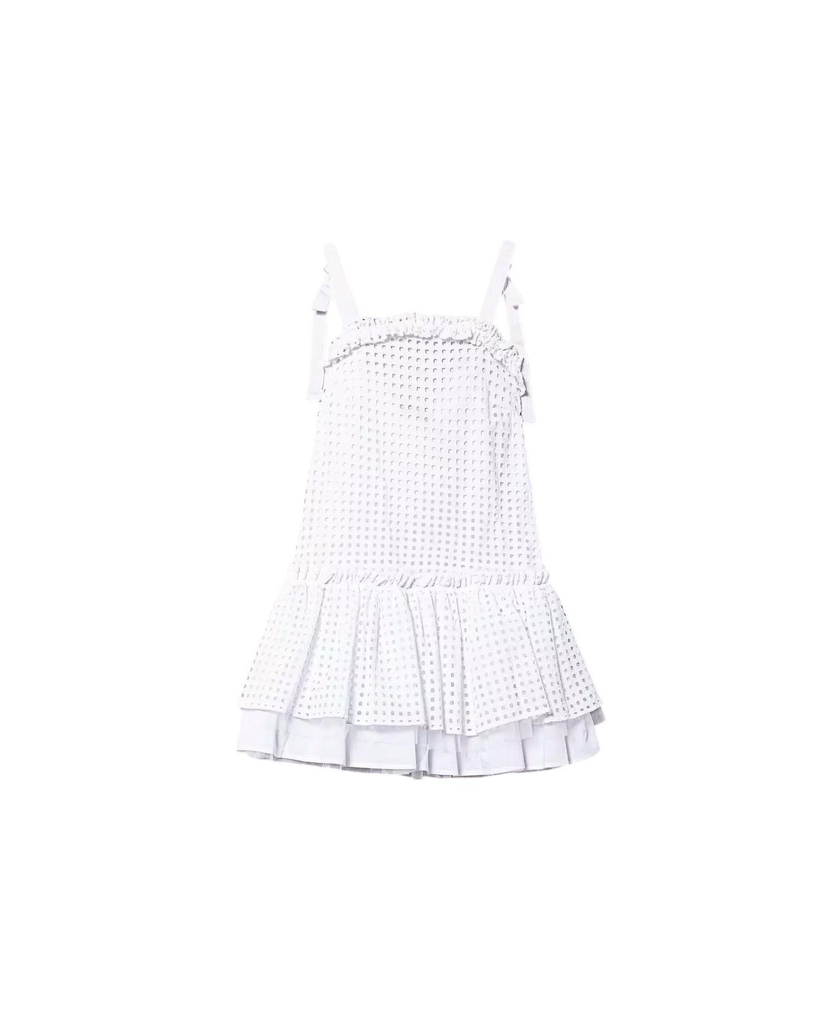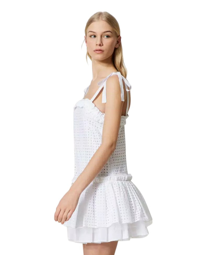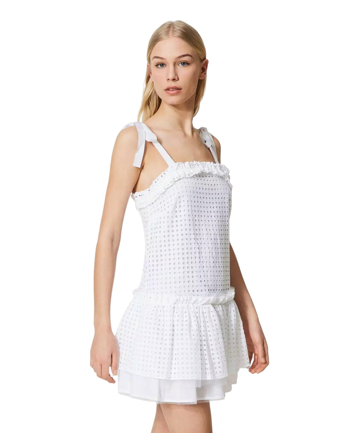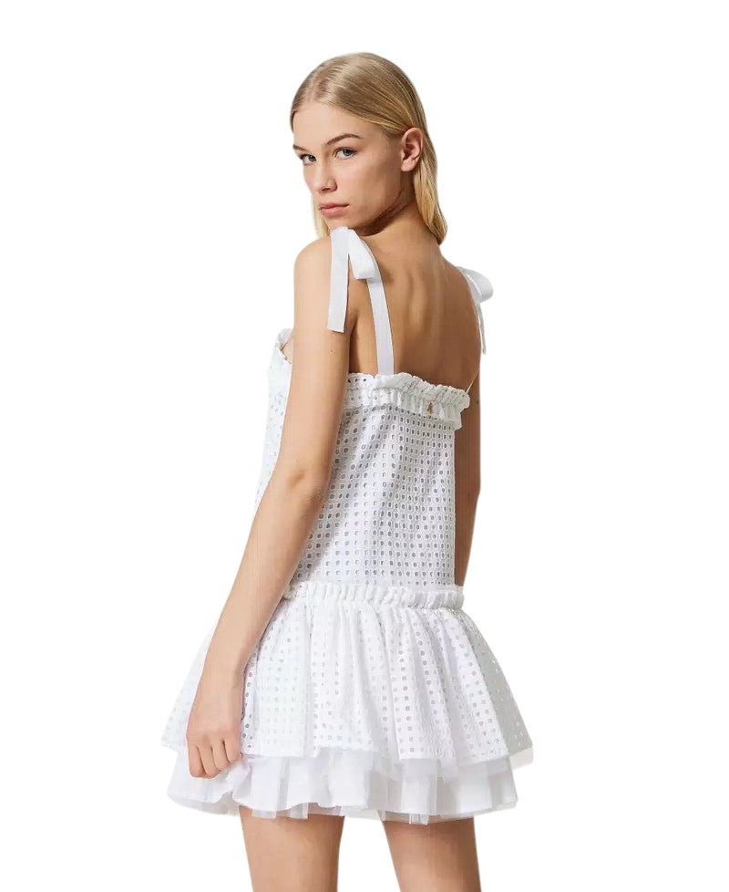 Abito corto a trapezio in sangallo con fodera in mussola di cotone, scollo quadrato davanti e dietro, spalline in gros-grain che si annodano a fiocco, sangallo arricciato applicato, balza in tulle e mussola al fondo.