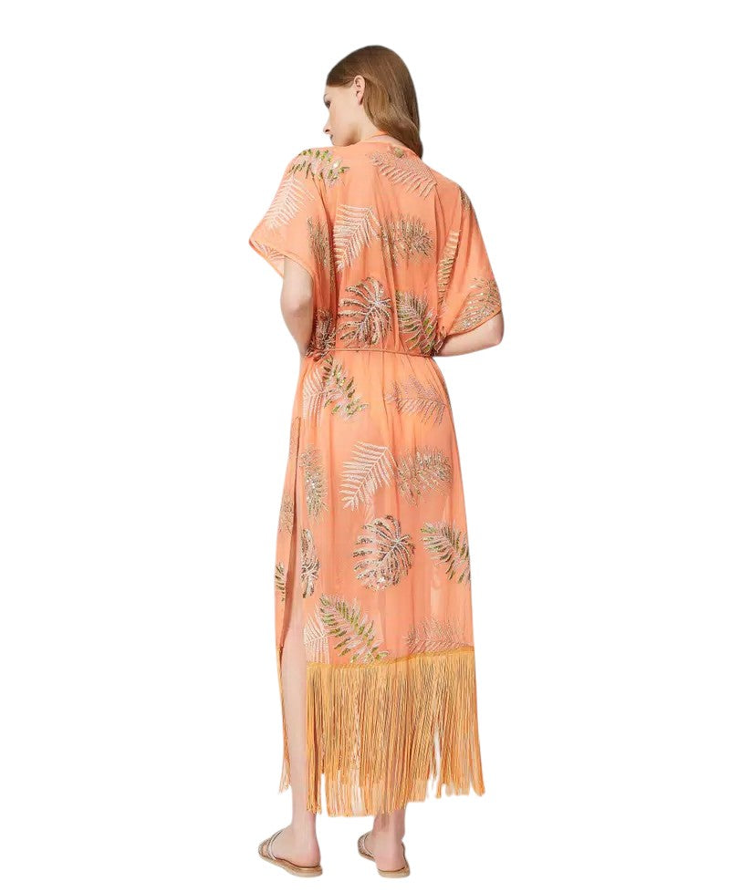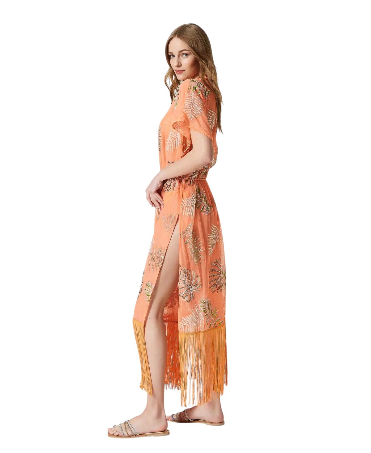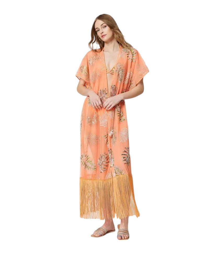 Caftano lungo in tulle con maniche corte, ricamo a filo, perle e coralli, frange al fondo, spacchi laterali.