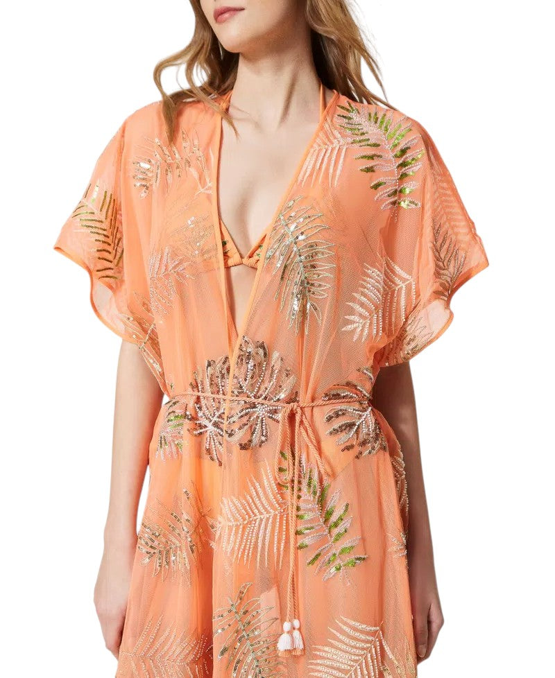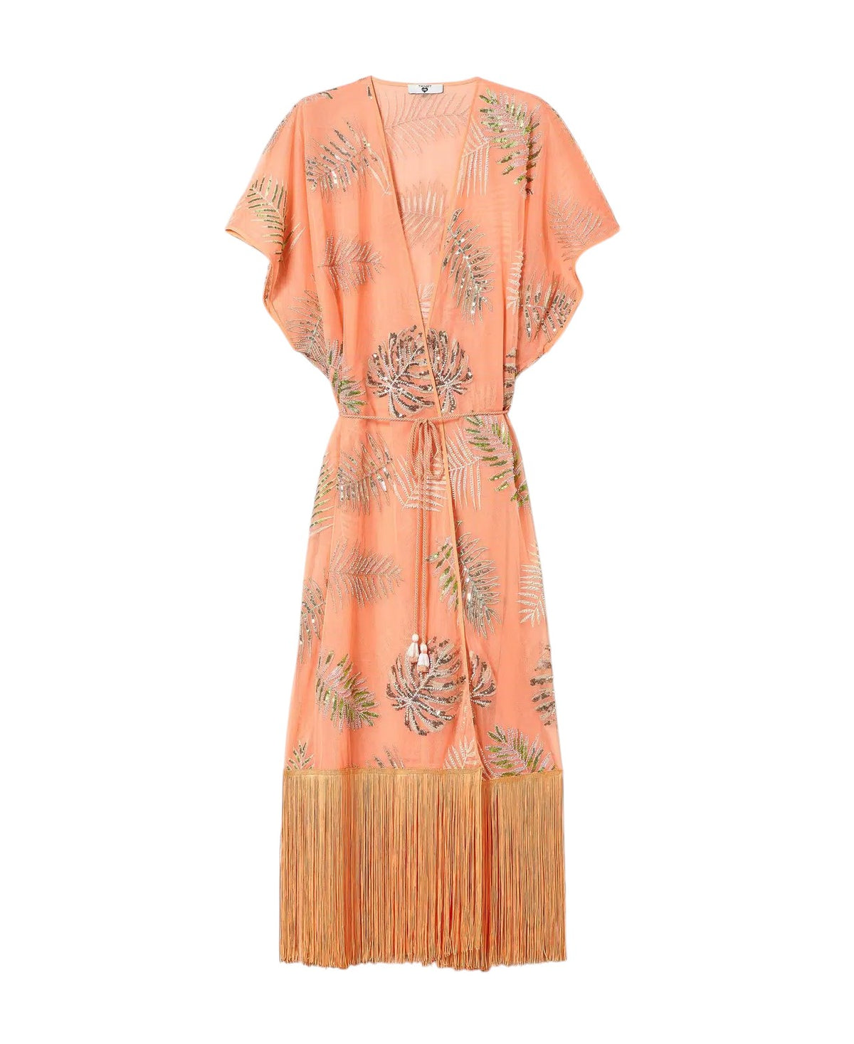 Ispirazione luxury resort per il caftano in tulle con ricamo a filo di foglie di palma illuminato da paillettes e coralli, parte superiore a kimono con scollatura a V e maniche corte, cintura in corda con nappe, profondi spacchi laterali, fondo con frange in trasparenza, retro doppiato in tulle. Uno design che si fa notare da mattina al tramonto.