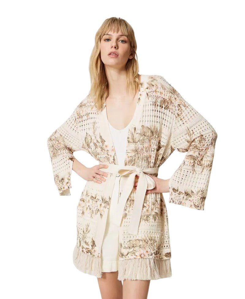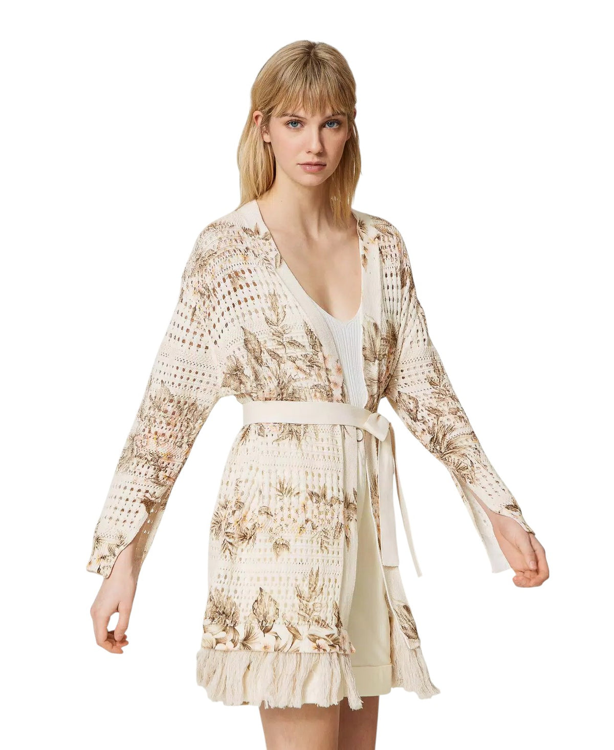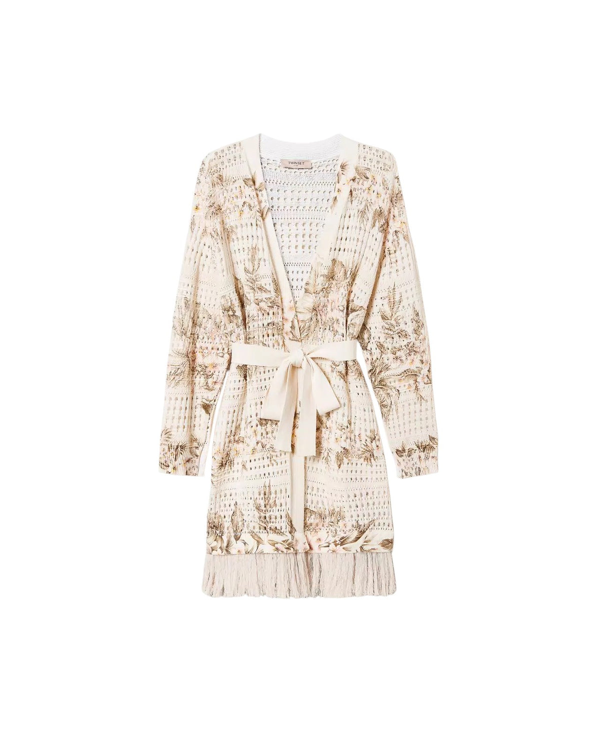 Maxi cardigan in cotone con misto traforato e rete, stampa piazzata, fondo sfrangiato, cintura.