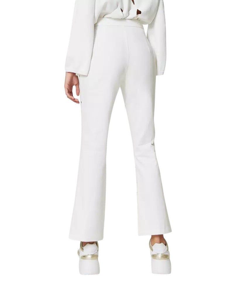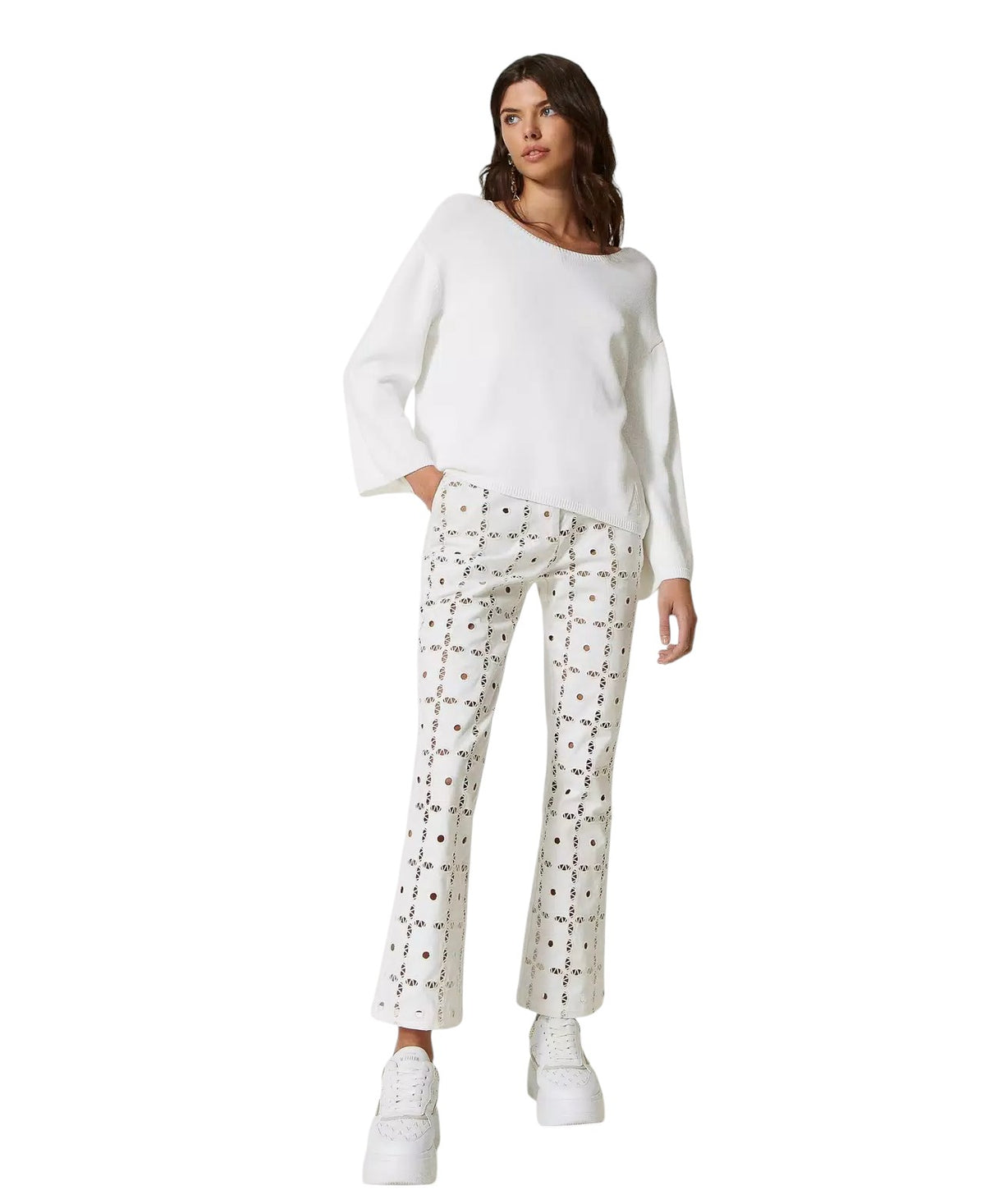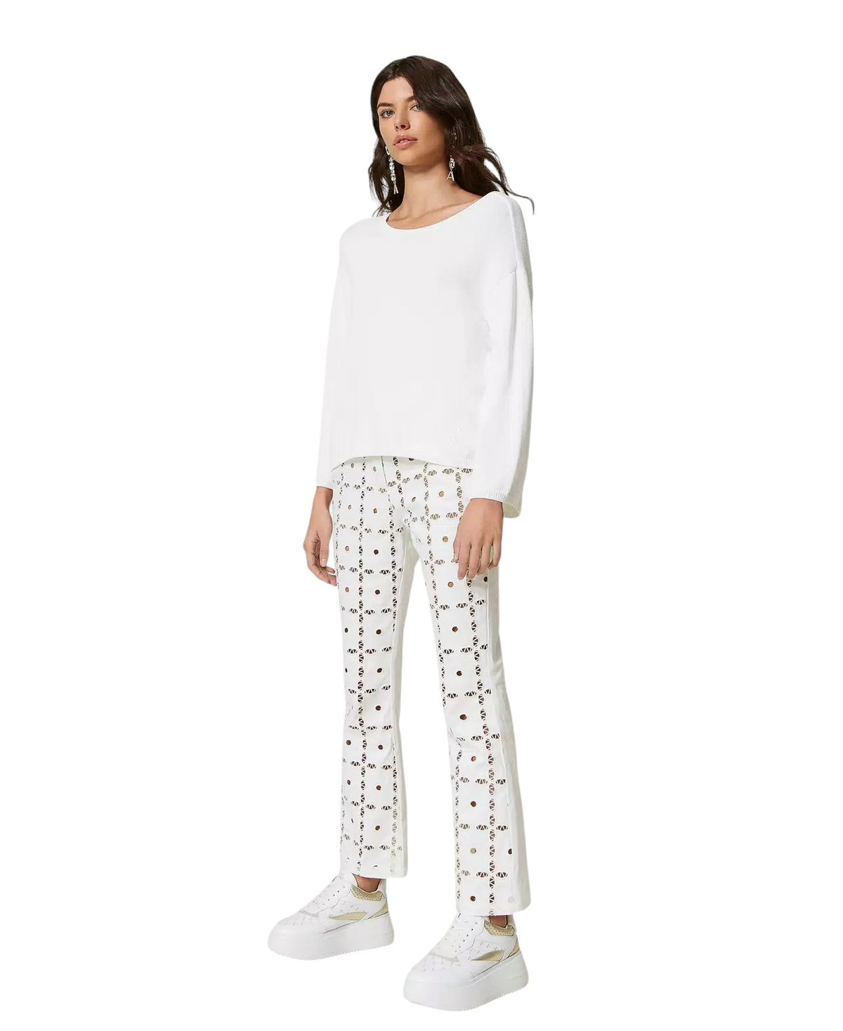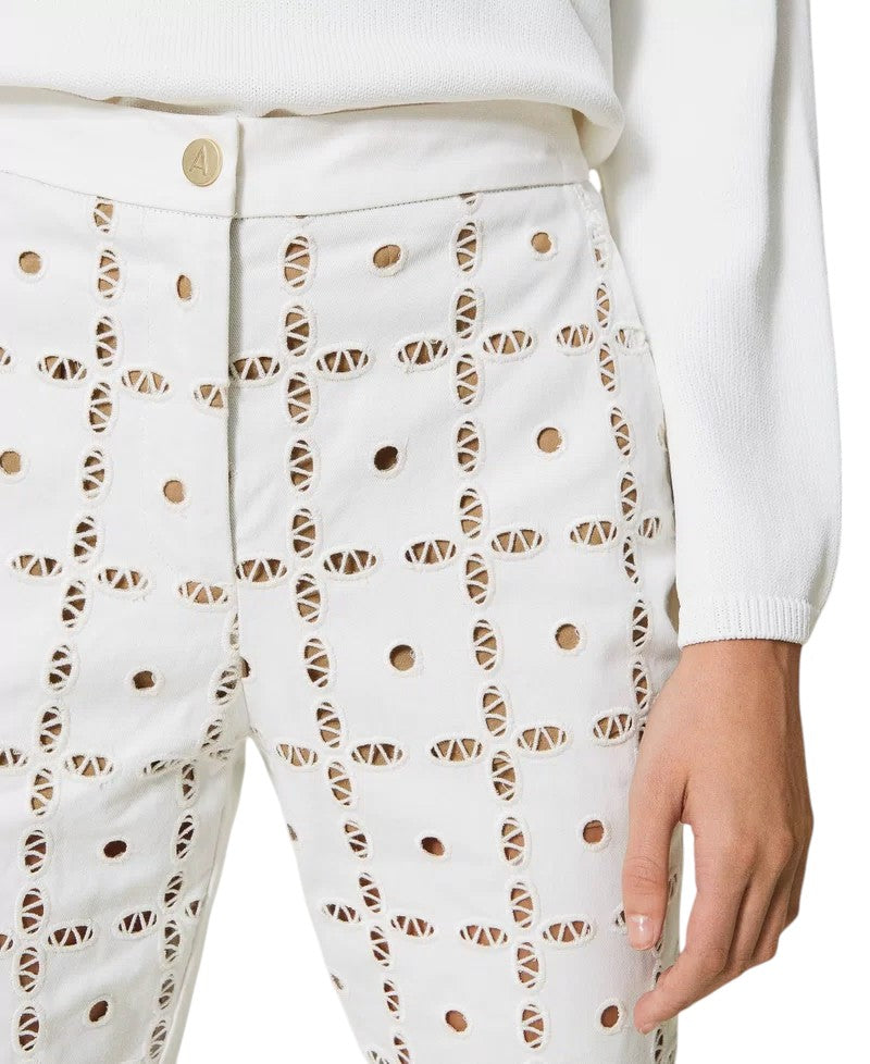 Pantaloni cropped collezione Actitude in gabardina di cotone con ricamo sangallo chech, gancio e bottone, shorts fodera a contrasto.