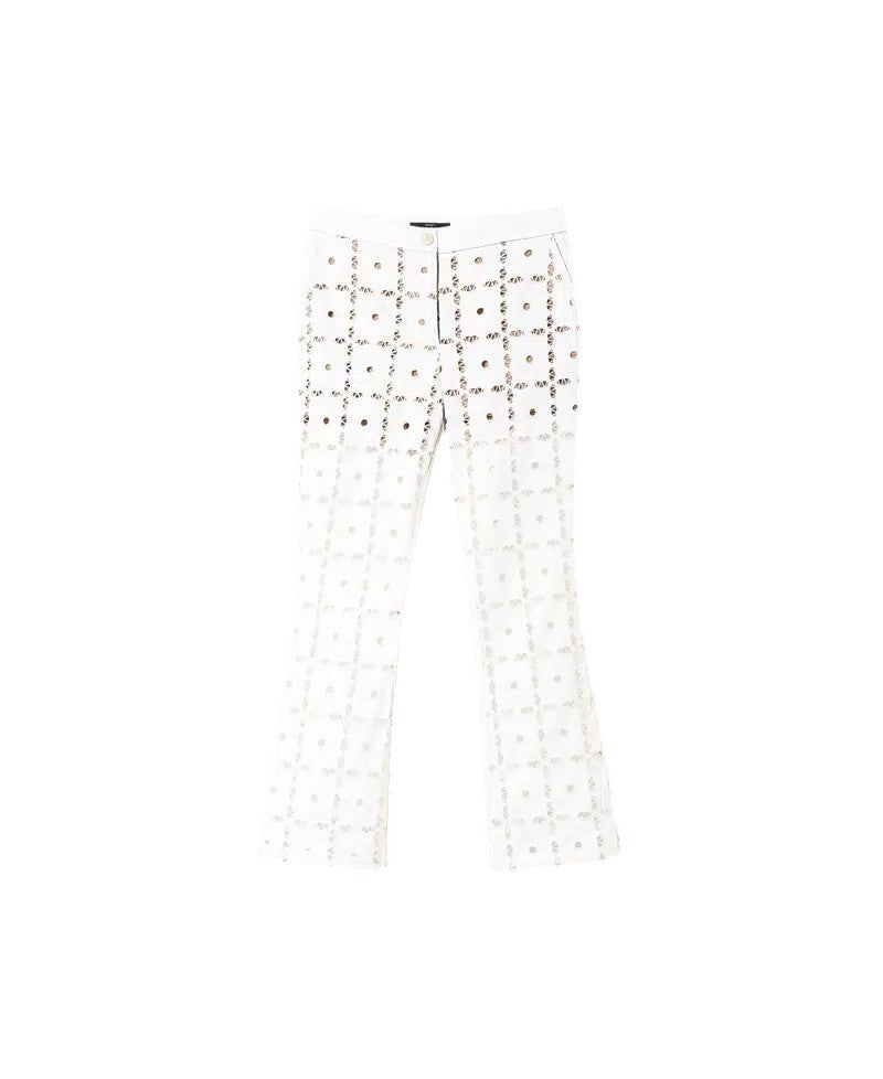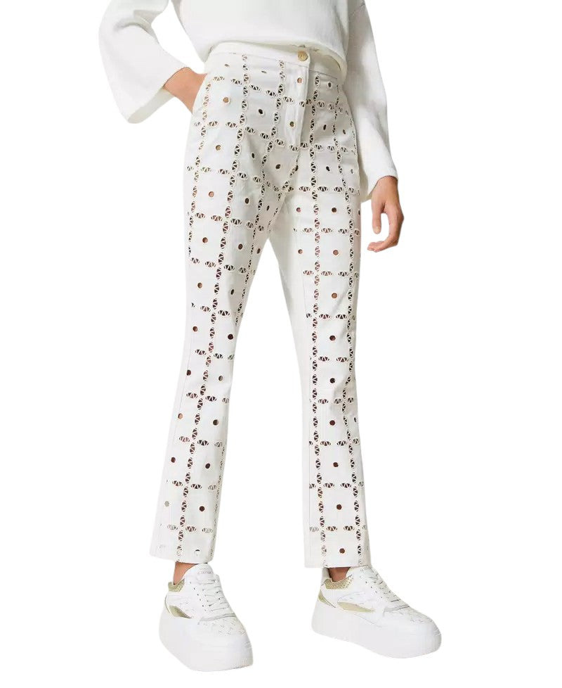 Ricamo all over per i pantaloni cropped in gabardina di cotone a disegno sangallo check. Chiusura con zip e gancio a uomo, tasche ai fianchi, pinces in vita che creano volume, shorts fodera in colore a contrasto.