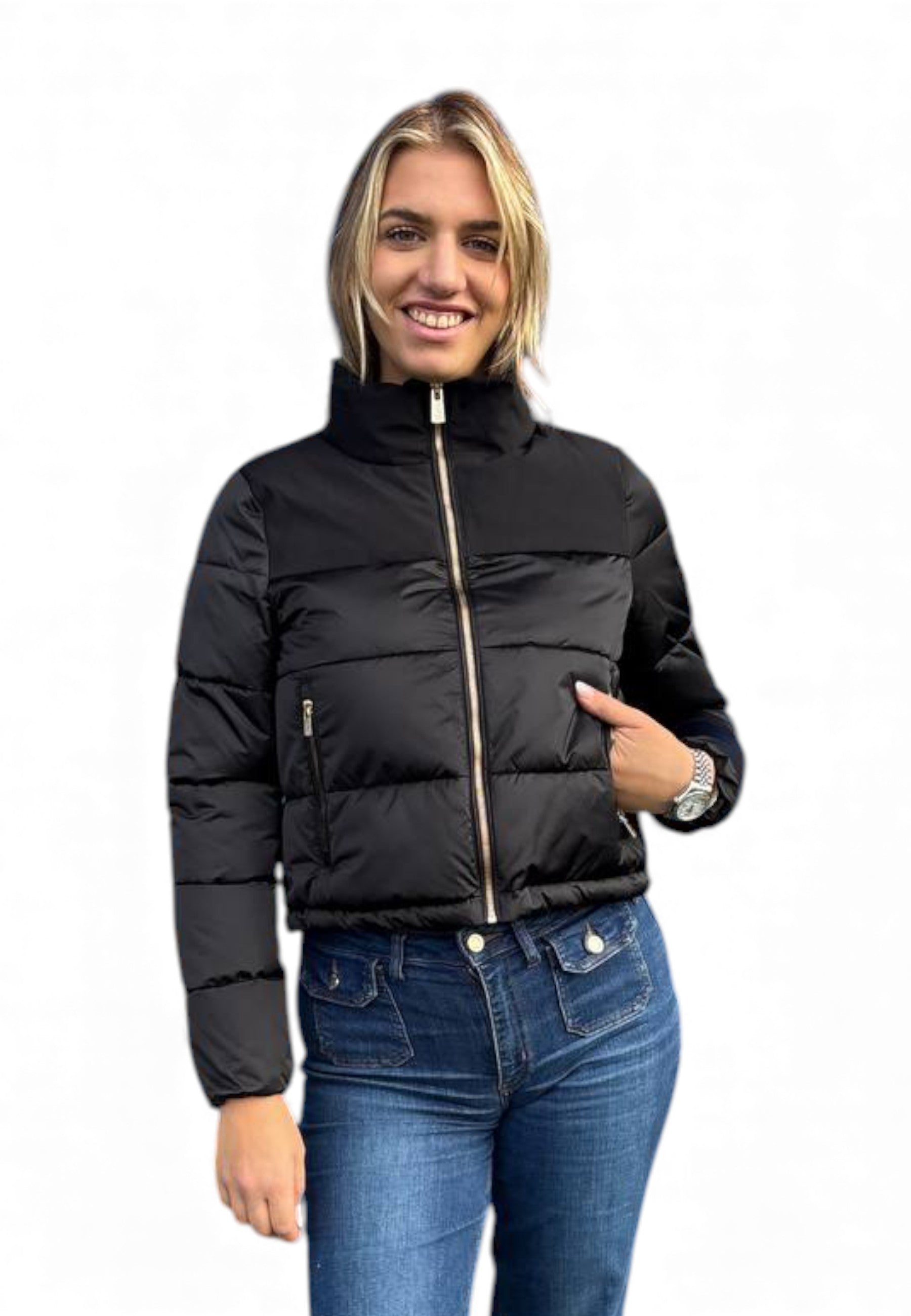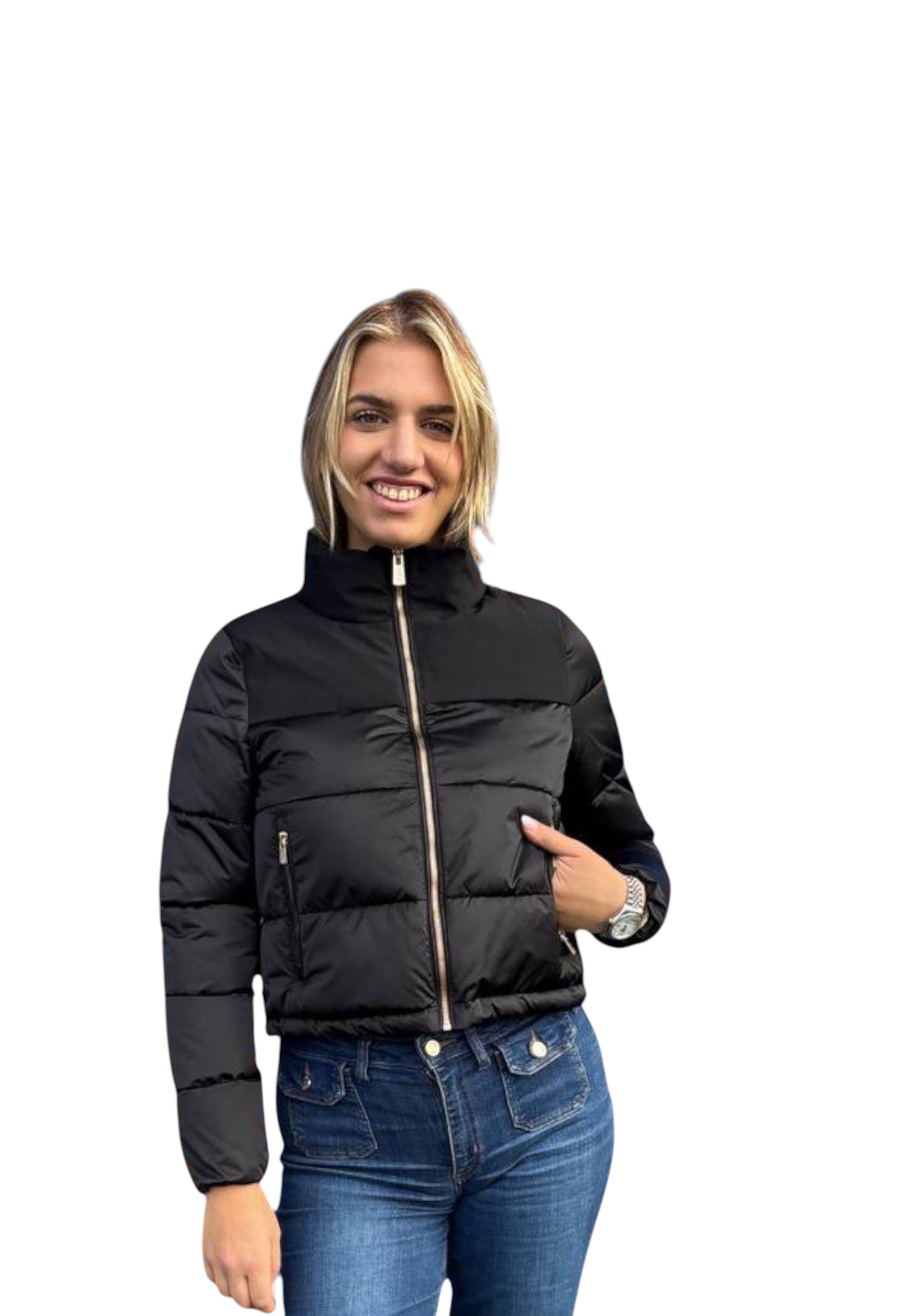 Piumino Yes Zee Nero corto. Senza cappuccio. Con zip anteriore dorata. Parte superiore del piumino liscia.