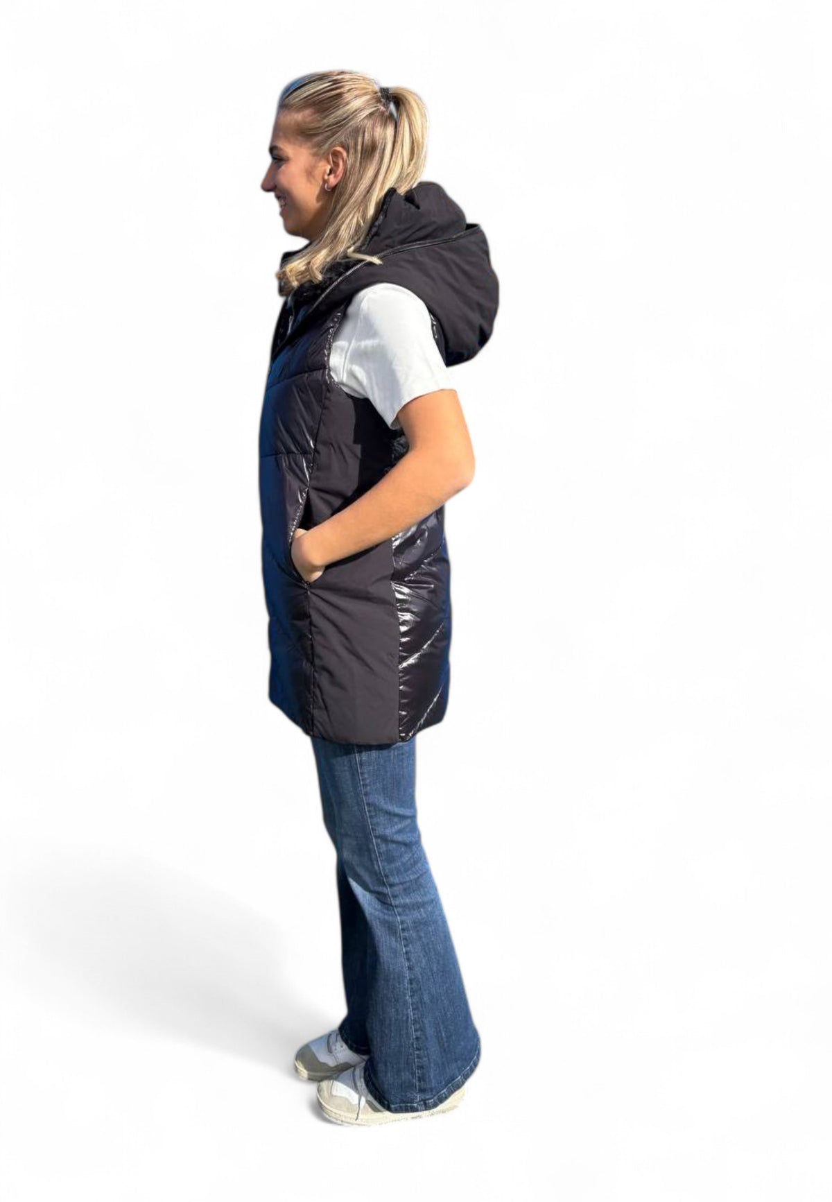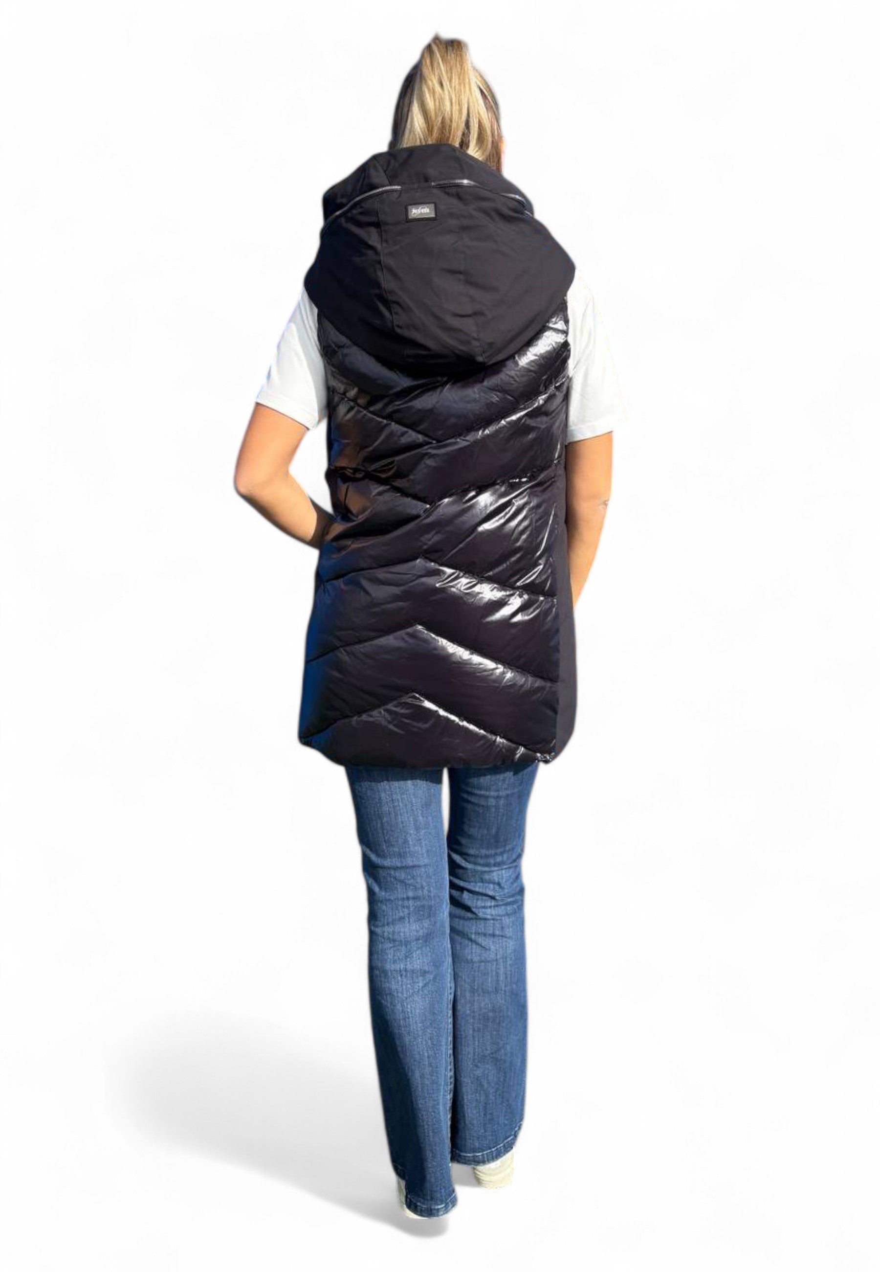 Design: Modello smanicato (gilet) di lunghezza media , con una linea moderna e leggermente avvitata che slancia la figura.