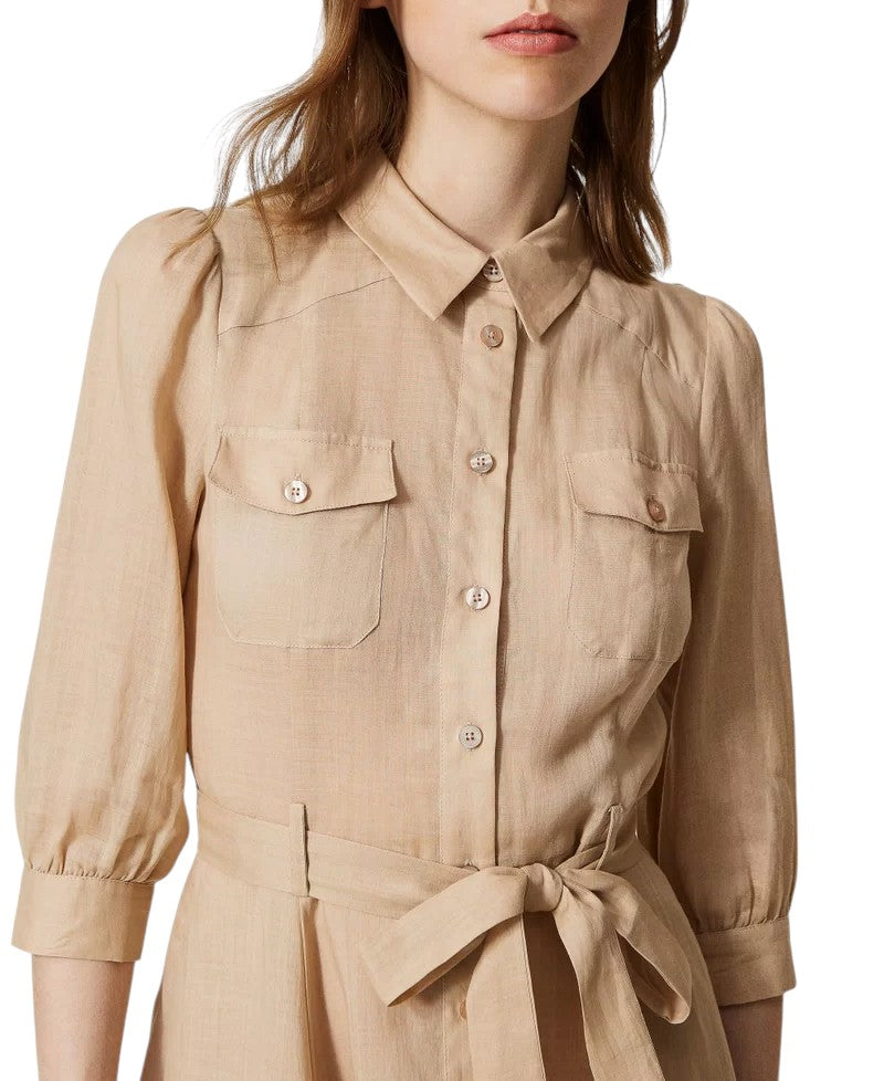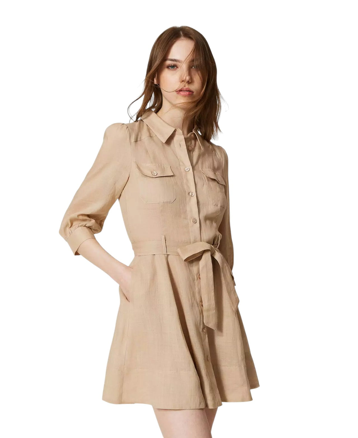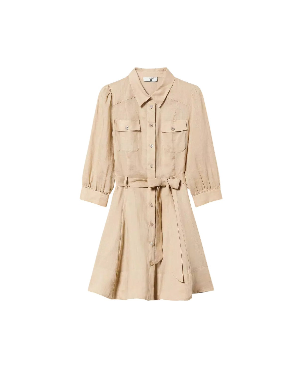 Abito chemisier corto in ramiè con colletto, taschini, maniche a tre quarti, chiusura con bottoni.
