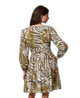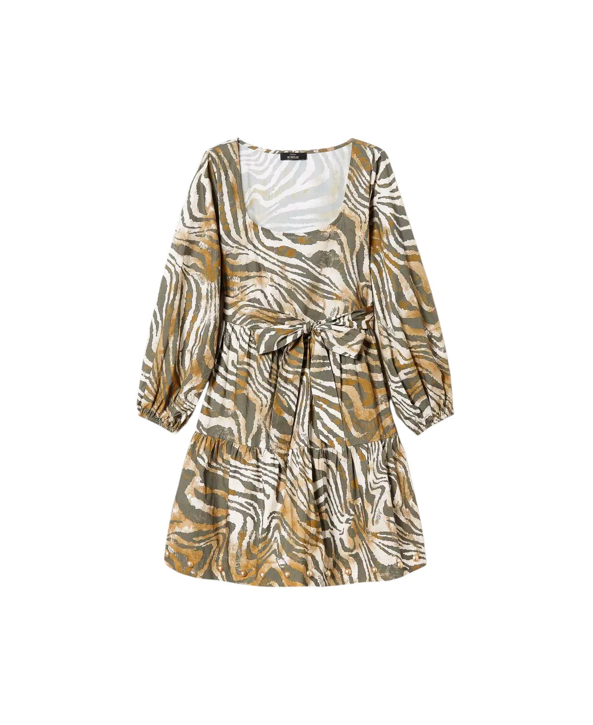 Abito corto in popeline di cotone a stampa animalier con collo squadrato e ampio, maniche lunghe con elastico e arricciatura ai polsi, balza al fondo. A-line da regolare in vita con la cintura abbinata. Il fondo è rifinito da una fila di borchie in metallo.