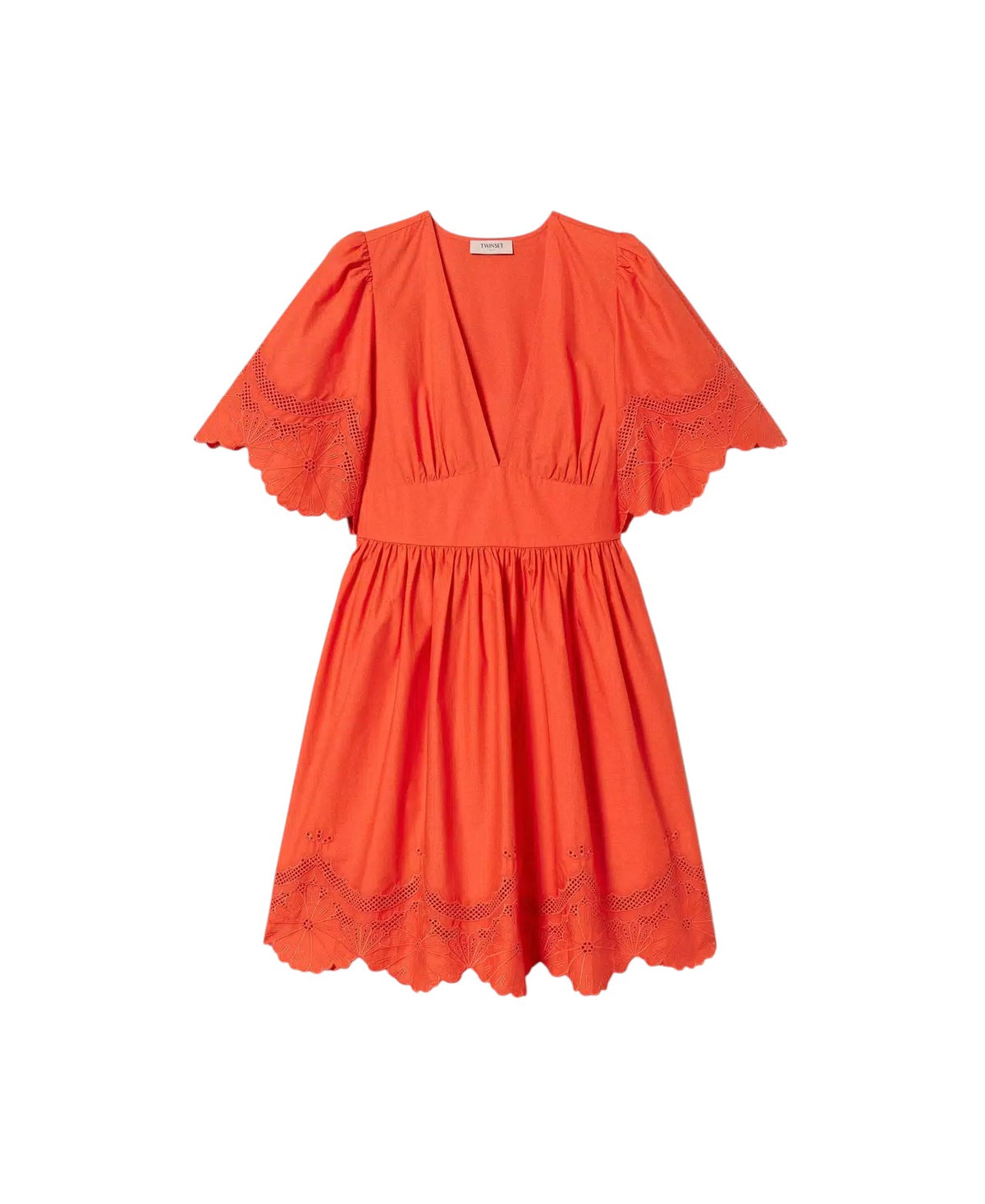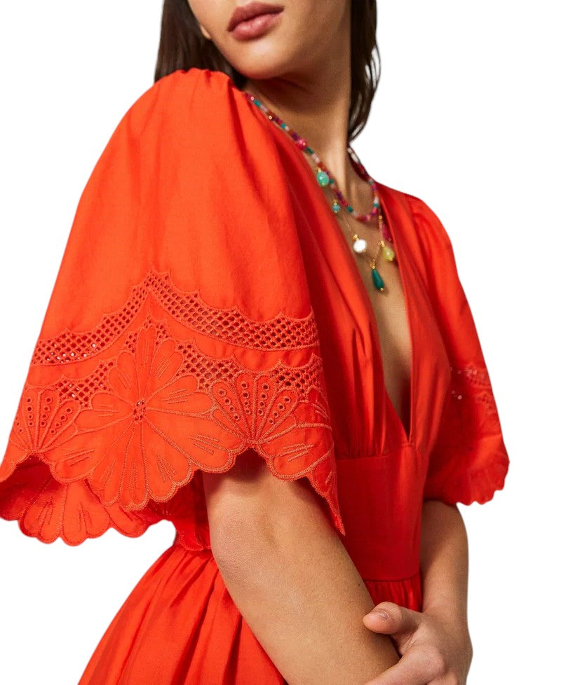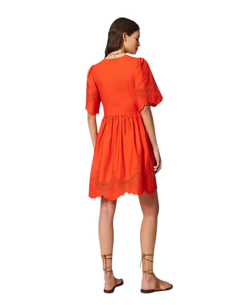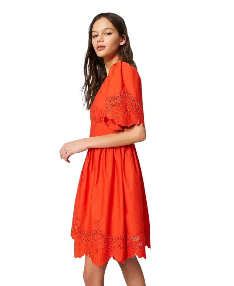 Abito corto in popeline di cotone leggero con inserti in rete in trasparenza sangallo. Linea svasata, scollo a V, maniche corte ampie ricamate ai bordi, corpetto accostato al corpo con taglio sotto il seno, intarsio in tessuto in vita, gonna ampia arricciata, zip al fianco, sfoderato, placchetta logo Oval T sul retro