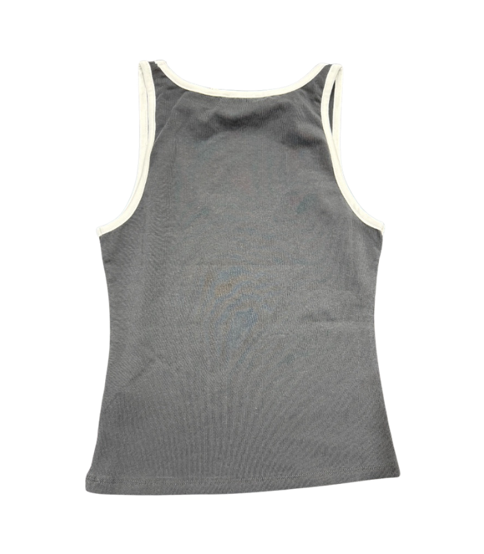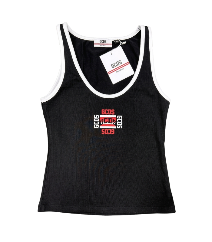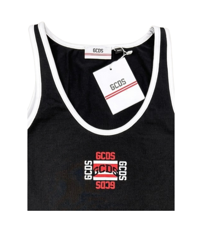 Top GCDS nero smanicato, con scritta centrale "GCDS" in rosso. Maglia adatta ad ogni tipo di look.