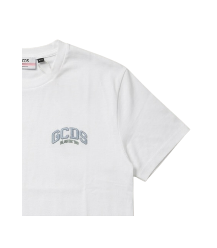 T-shirt GCDS bianca, con scritta in alto a sinistra "GCDS Milano Italy 1988" in celeste. Maglia adatta ad ogni tipo di look.