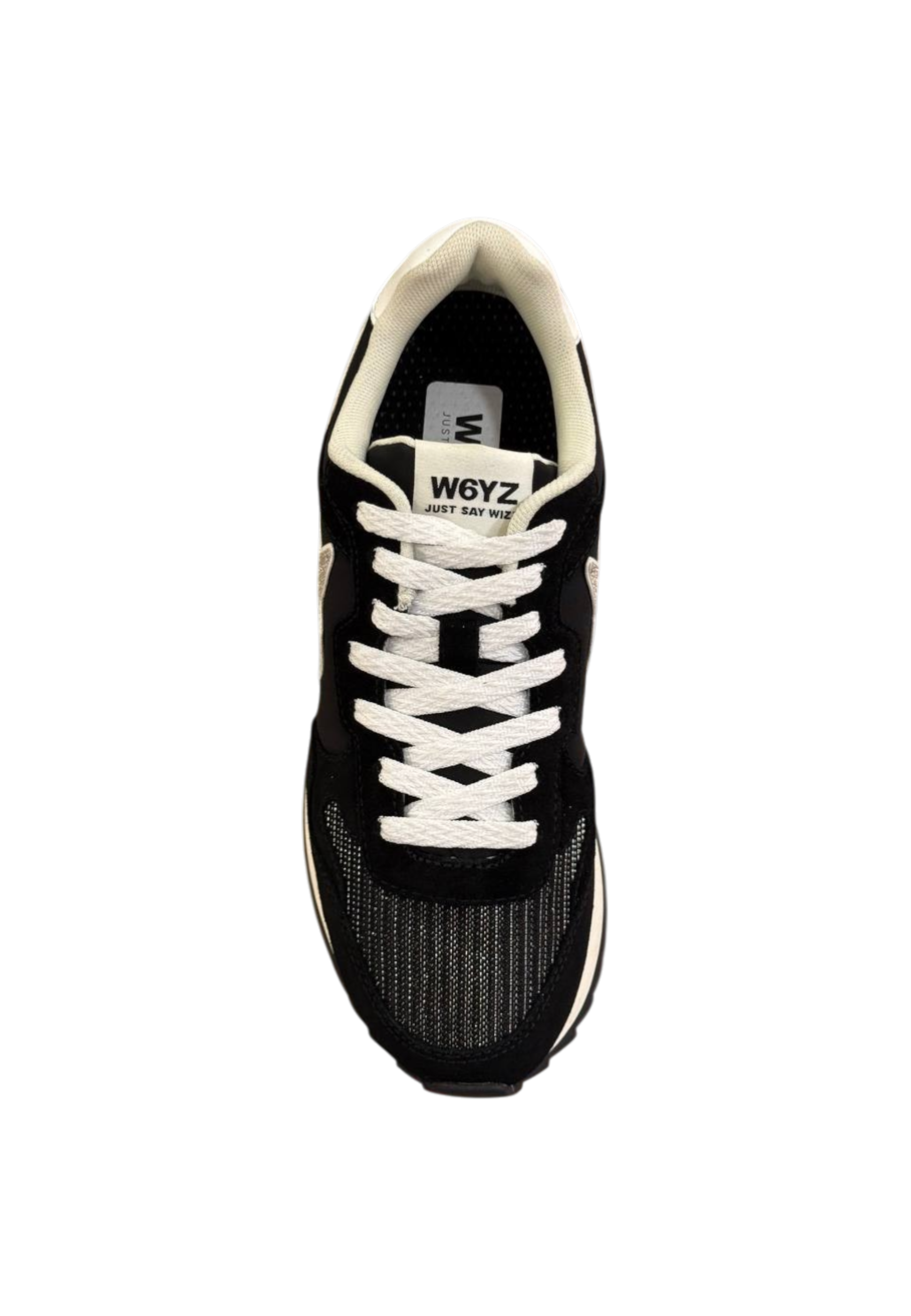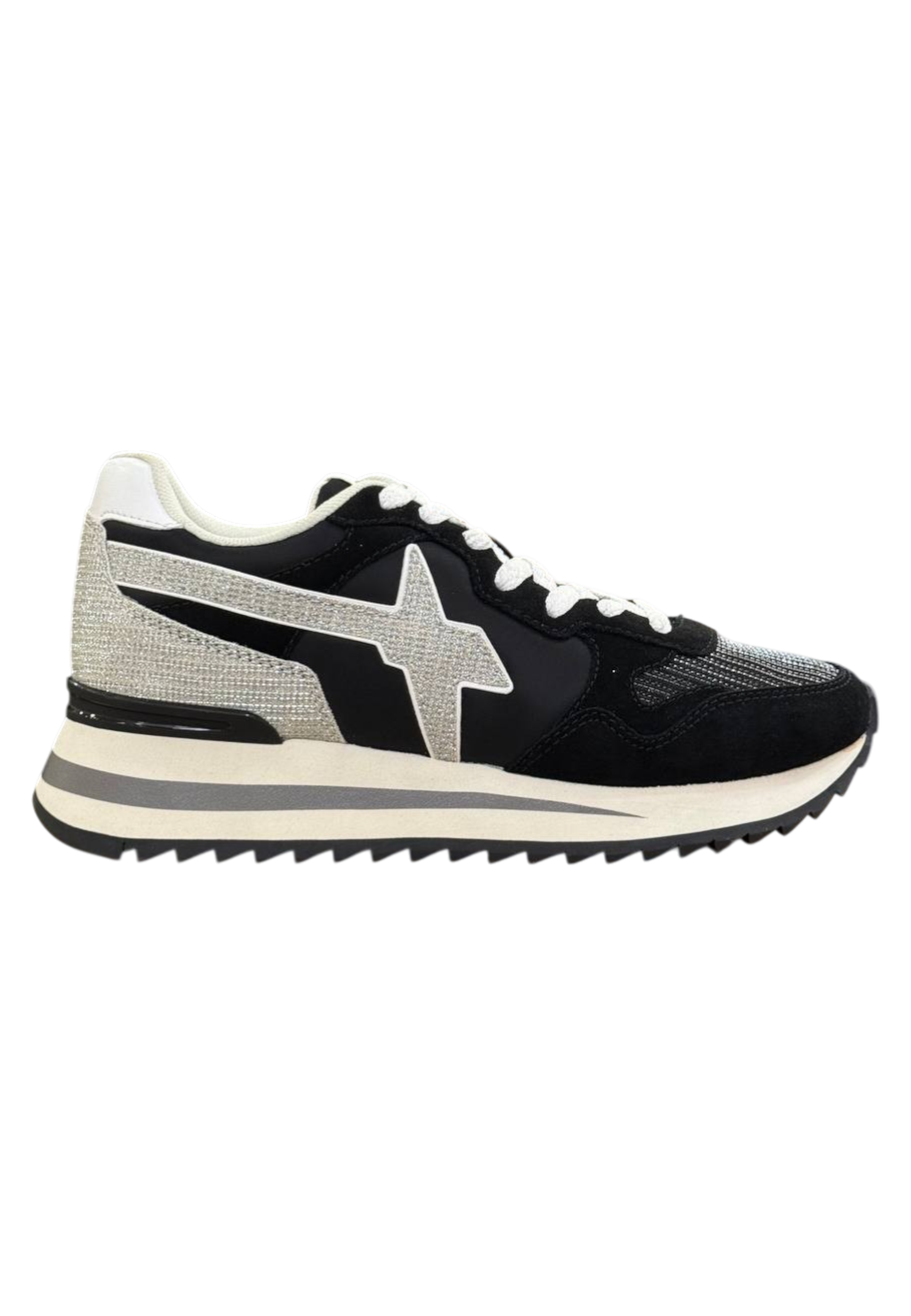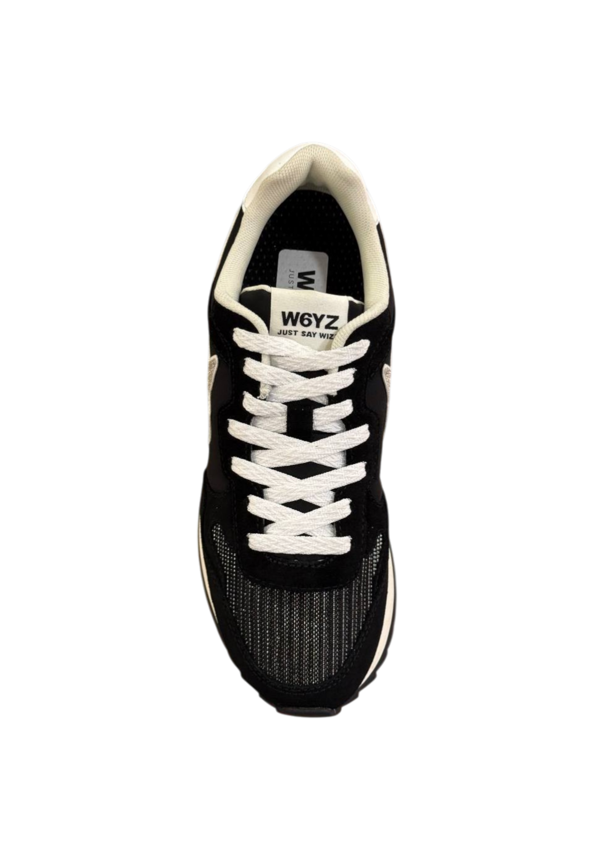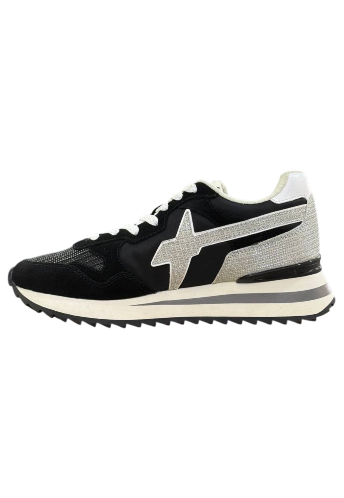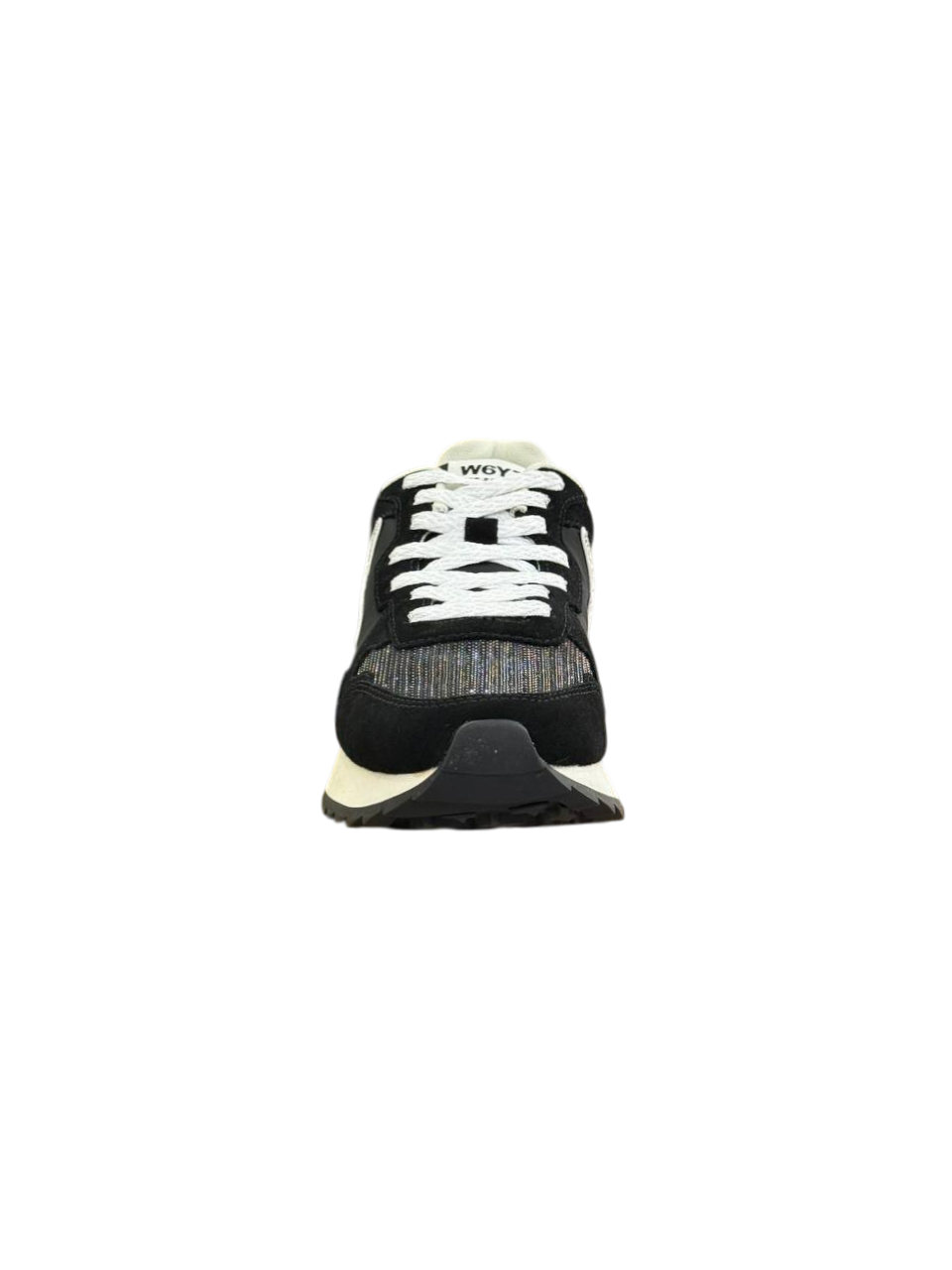 Sneaker W6YZ da donna in tessuto suede bianco-nero con fodera in tessuto, soletta interna in tessuto, suola in gomma, chiusura con lacci e inserti in filo metallico effetto glitter.
