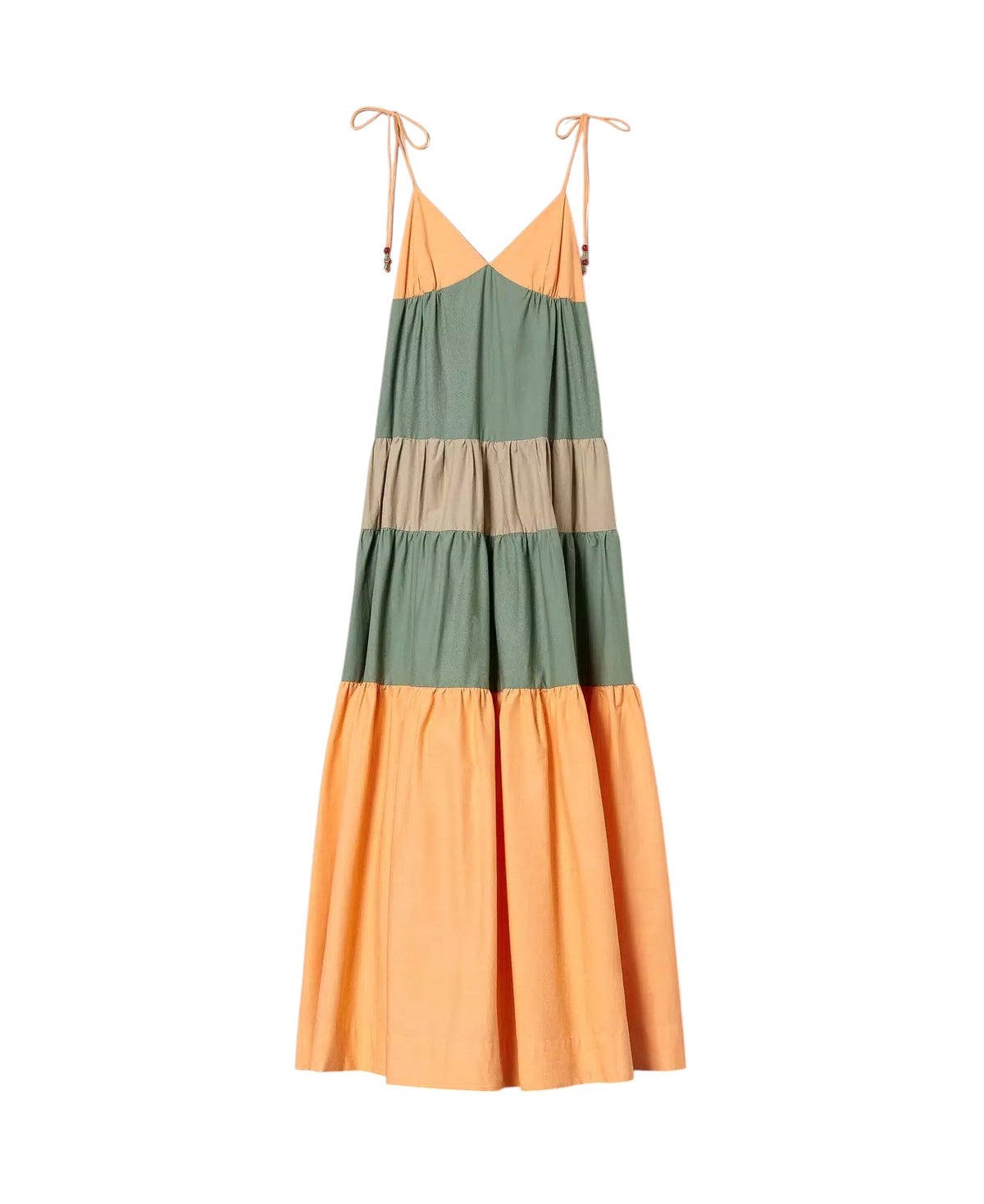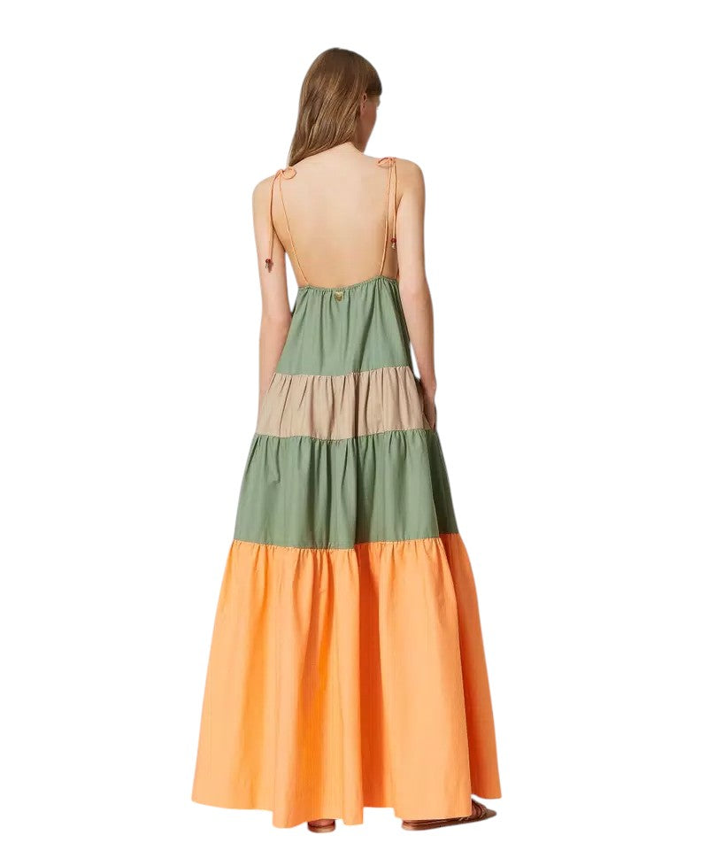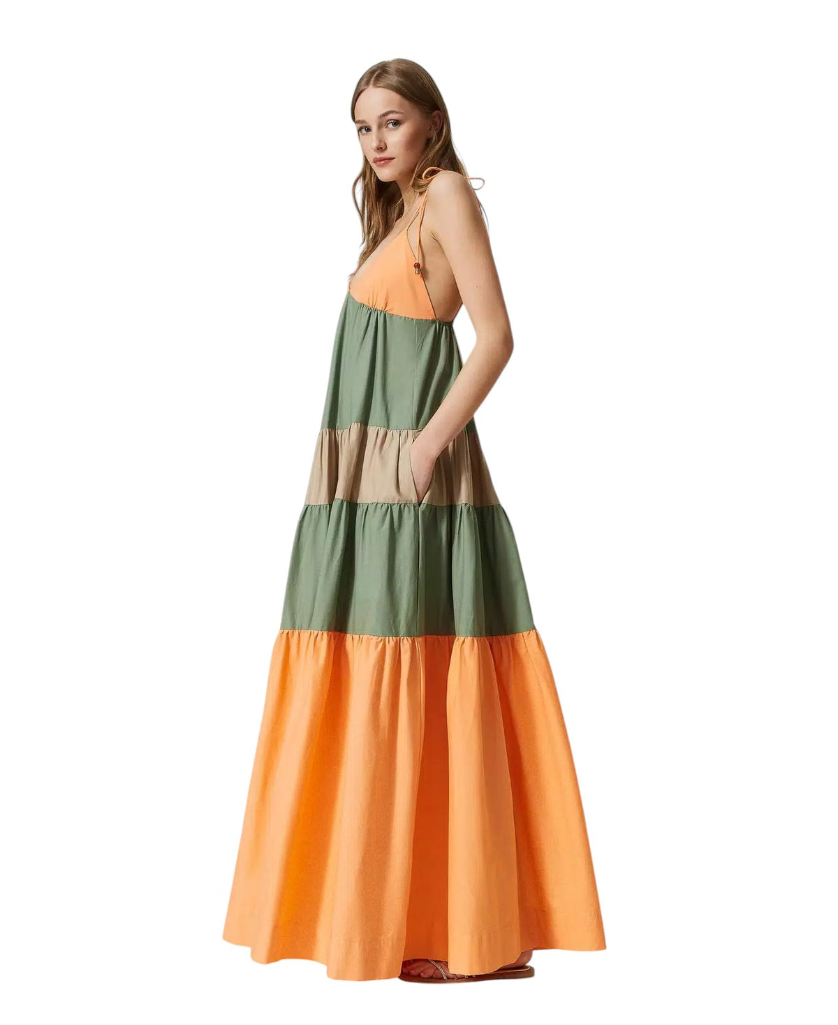 Abito lungo in popeline a balze bicolori, con spalline sottili da annodare a fiocco, terminale in metallo e vetro, scollatura a V con coppe a triangolo doppiate in tessuto, tasche ai fianchi, elastico sul retro
