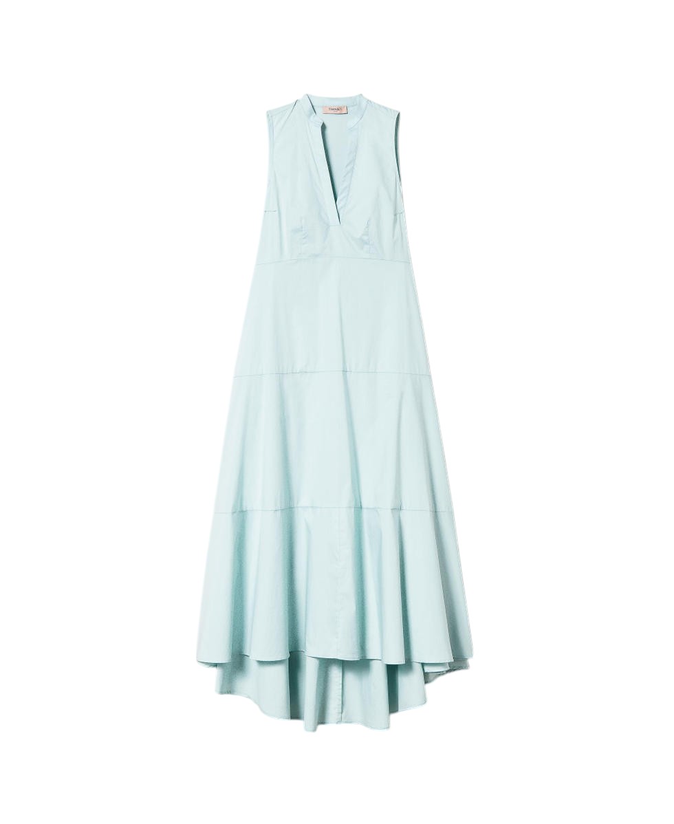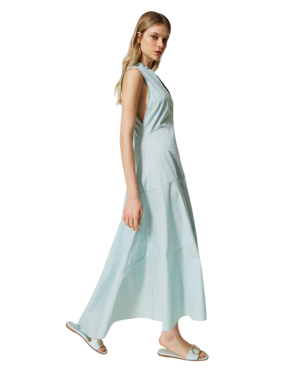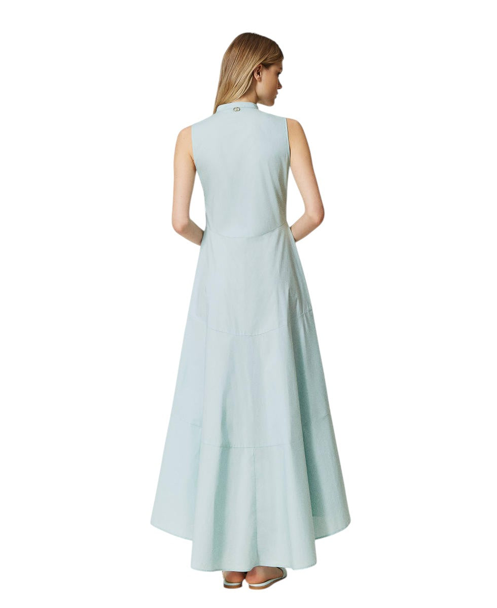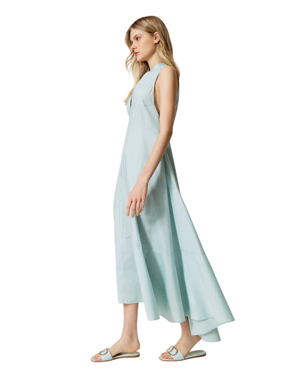 Abito lungo senza maniche in popeline di cotone stretch, scollo alla coreana con apertura a V, gonna ampia con tagli asimmetrici.