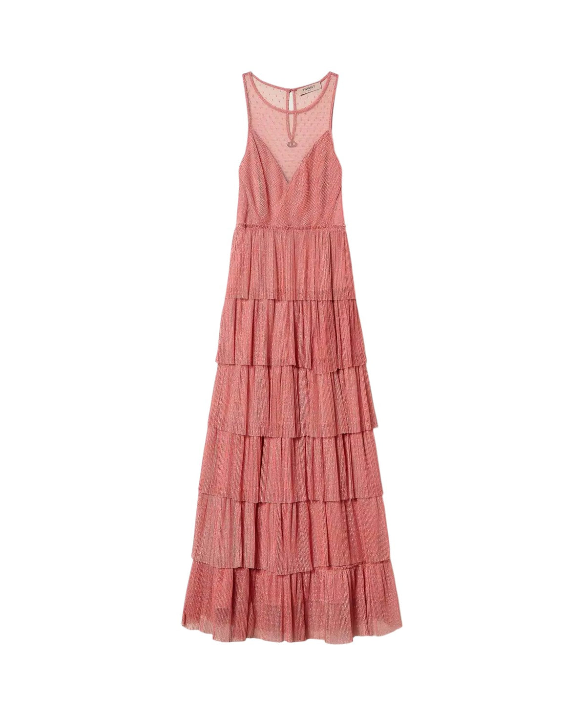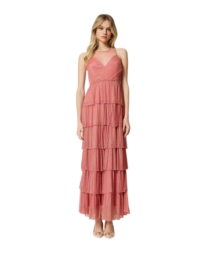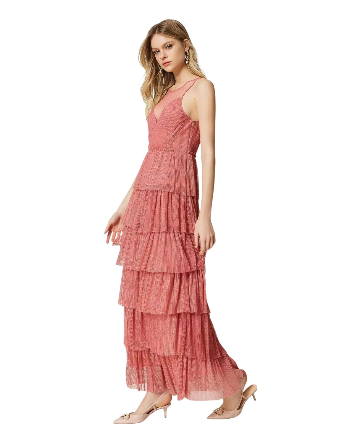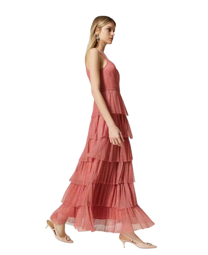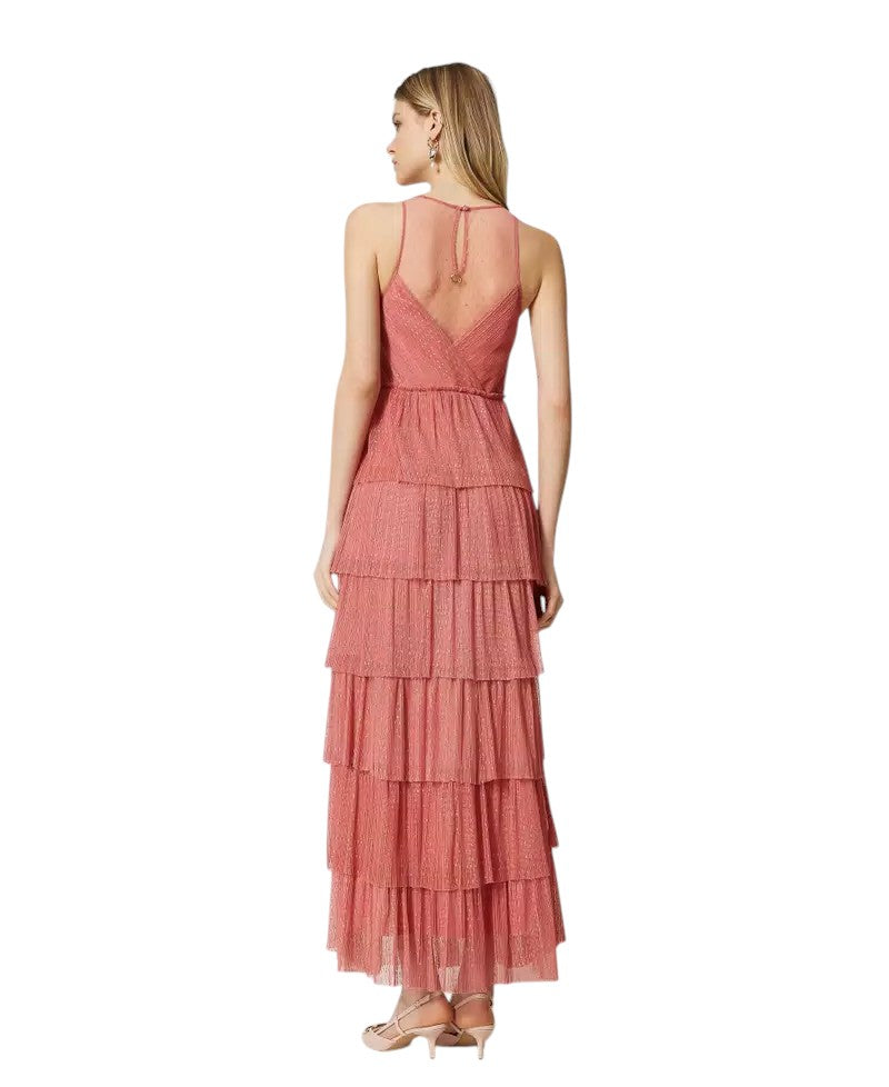 Abito lungo senza maniche in popeline di cotone stretch, scollo alla coreana con apertura a V, gonna ampia con tagli asimmetrici.