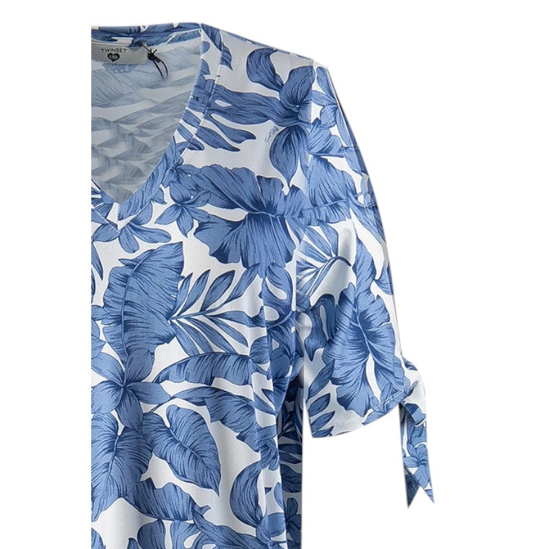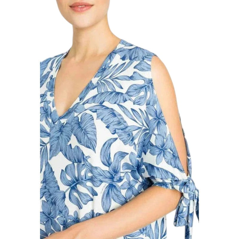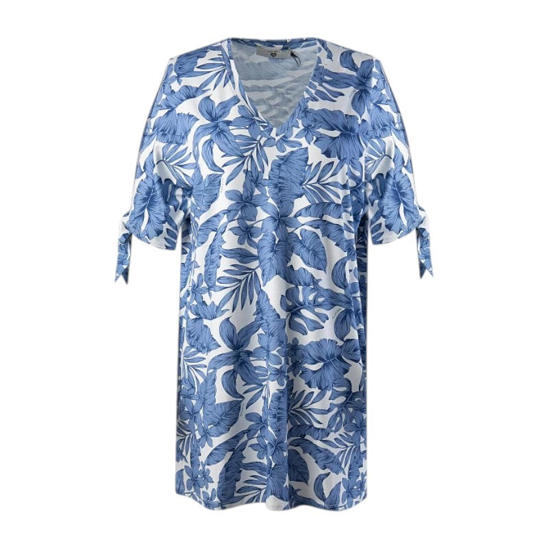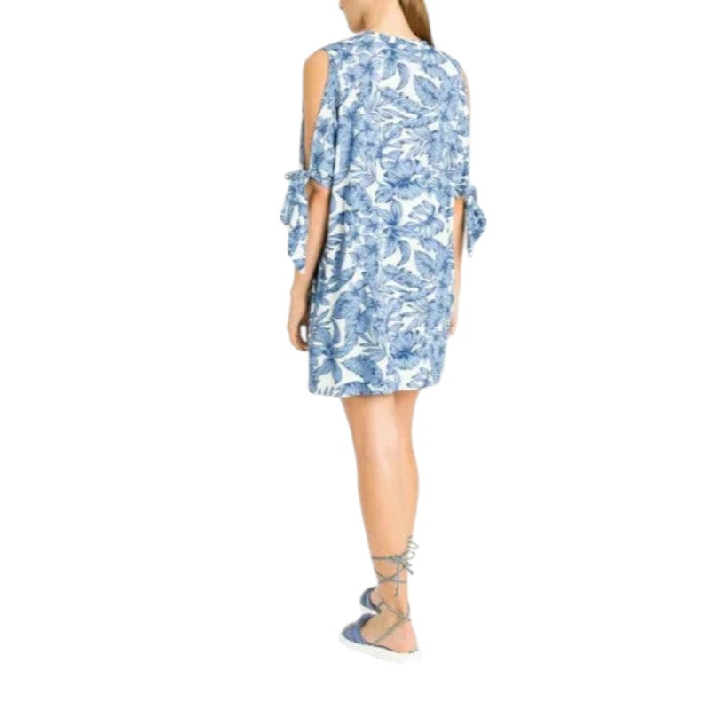 Mini abito in viscosa stampa foglie. Scollatura profonda a V, mezza manica aperta sulle braccia e chiusa da fiocchetti, linea ampia.