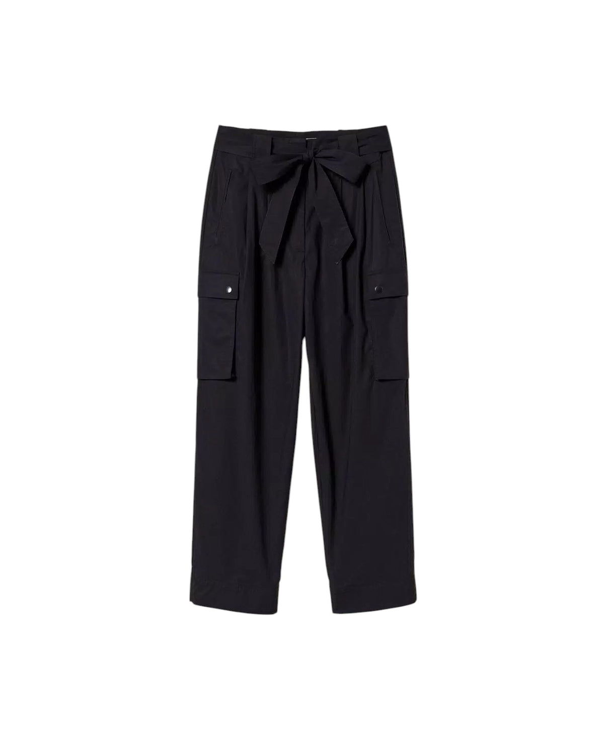 Pantaloni cargo a vita alta in popeline di cotone stretch con pieghe in vita, tasche laterali a toppa con patte, cintura abbinata.