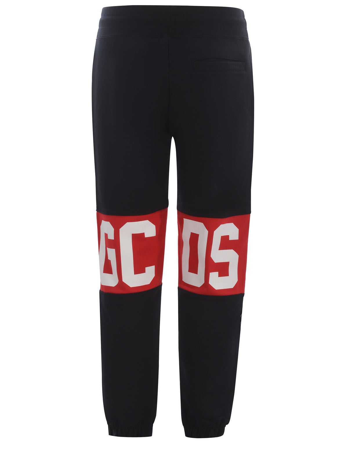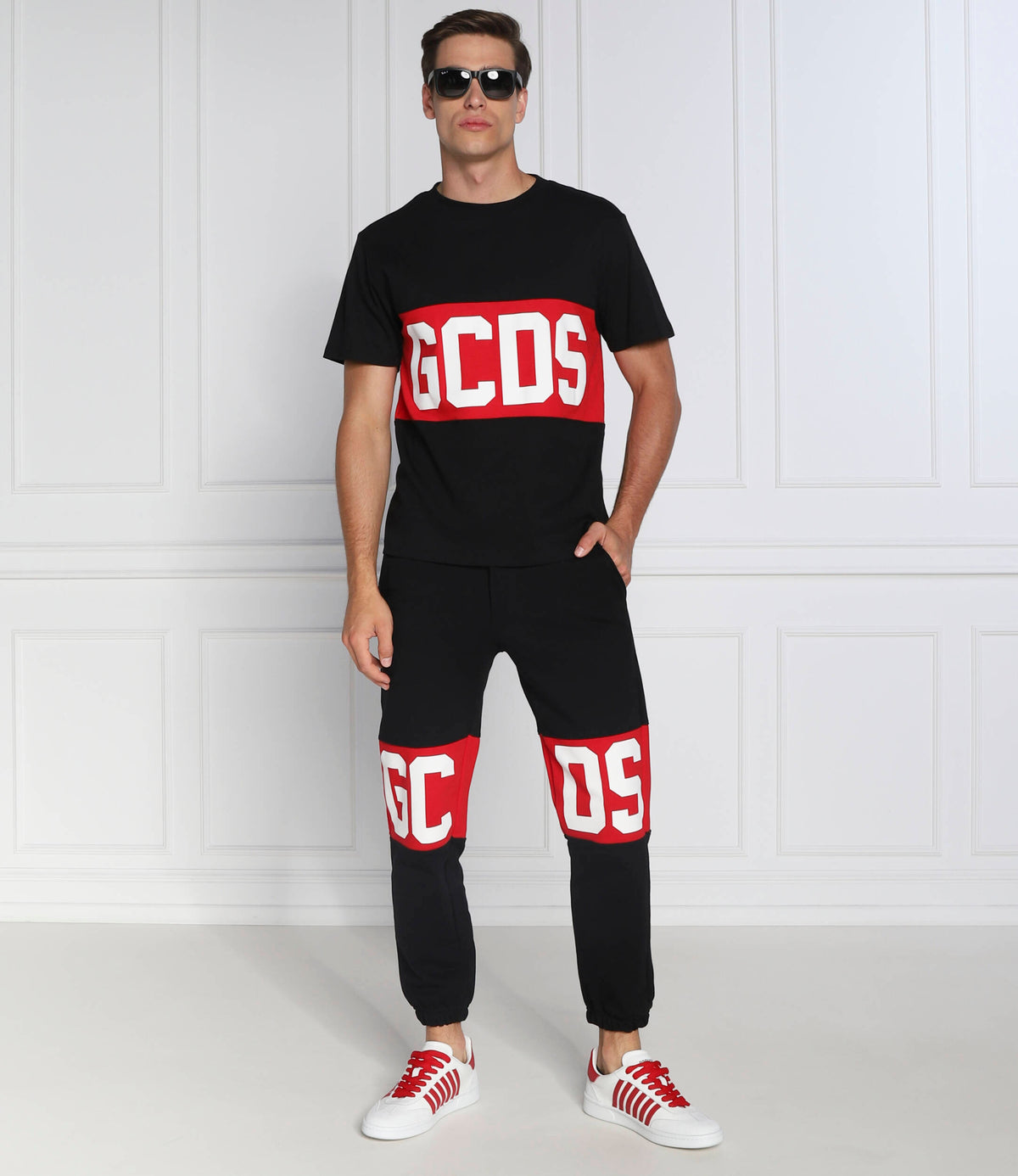 Pantaloni GCDS in cotone Nero. Elastico in vita con coulisse. Tasche laterali. Bande logo "GCDS" a contrasto Bianco/Rosso sulle gambe. Patch logo applicato di lato. Elastico al fondo. Tasca a filetto sul retro.