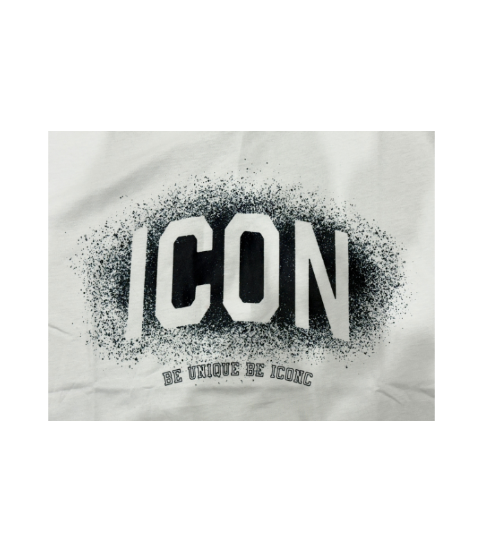 T-shirt Icon, con girocollo classico a maniche corte, ideale per un look casual. La maglietta è protetta dalla scritta "icon" centrale circondata da un effetto "spray" blu sfumato e sotto ad esso possiamo trovare la scritta " be unique be iconic".