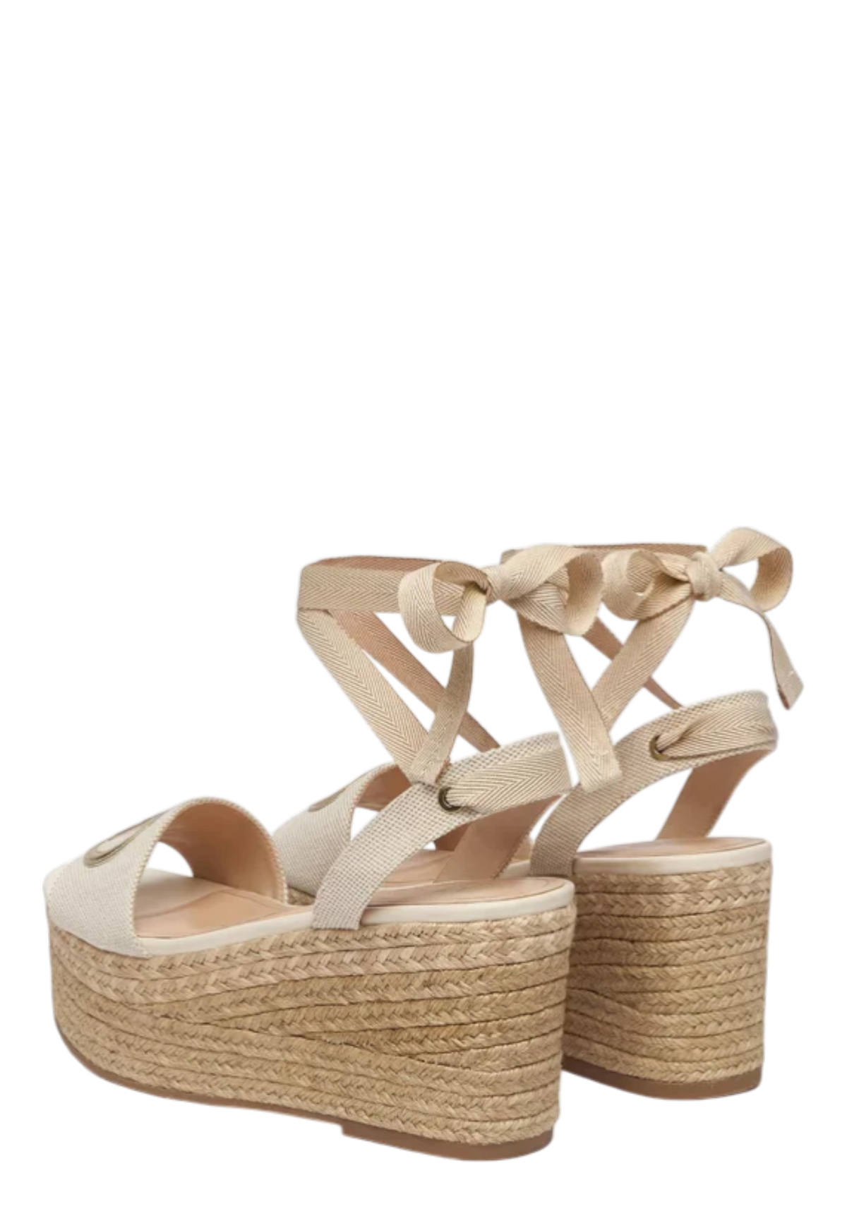Sandali firmati Liu Jo con fascette in canvas, chiusura con lacci regolabili, patch logo monogram in pelle metallizzata, zeppa rivestita in corda intrecciata alta 8,5cm