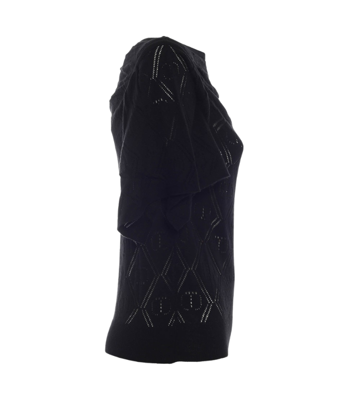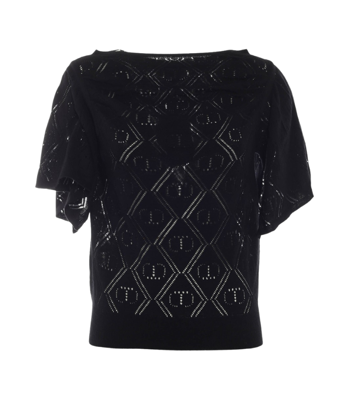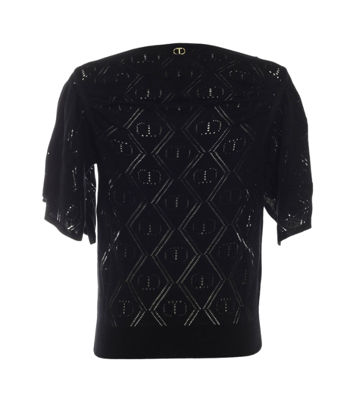 Maglia in misto cotone con lavorazione traforata a motivo monogram Oval T. Con collo a barchetta, maniche corte a volant. Una maglia in misto cotone e cashmere con lavorazione traforata, Il logo Oval T diventa un motivo monogram con lavorazione traforata.