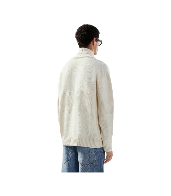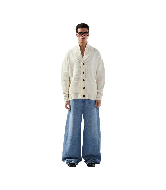 Cardigan in maglia compatta con chiusura frontale a bottoni e logo. Modello a girocollo con spalle scese e finiture a costine su polsini e fondo.